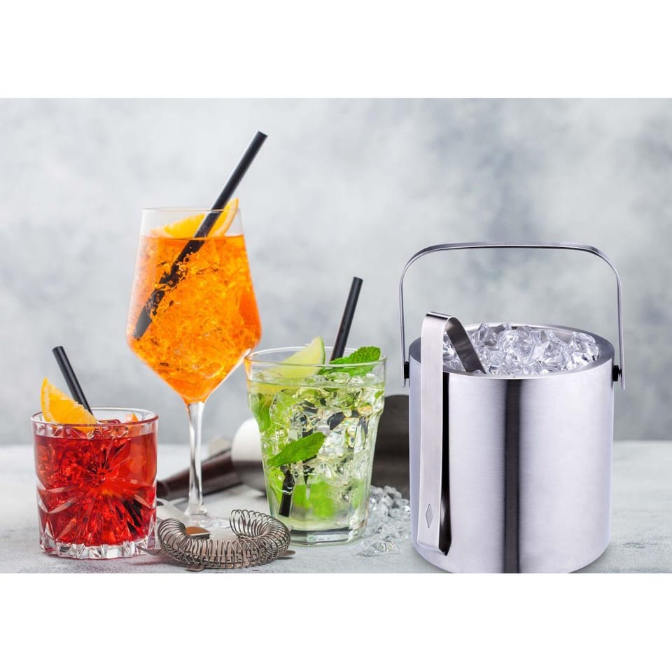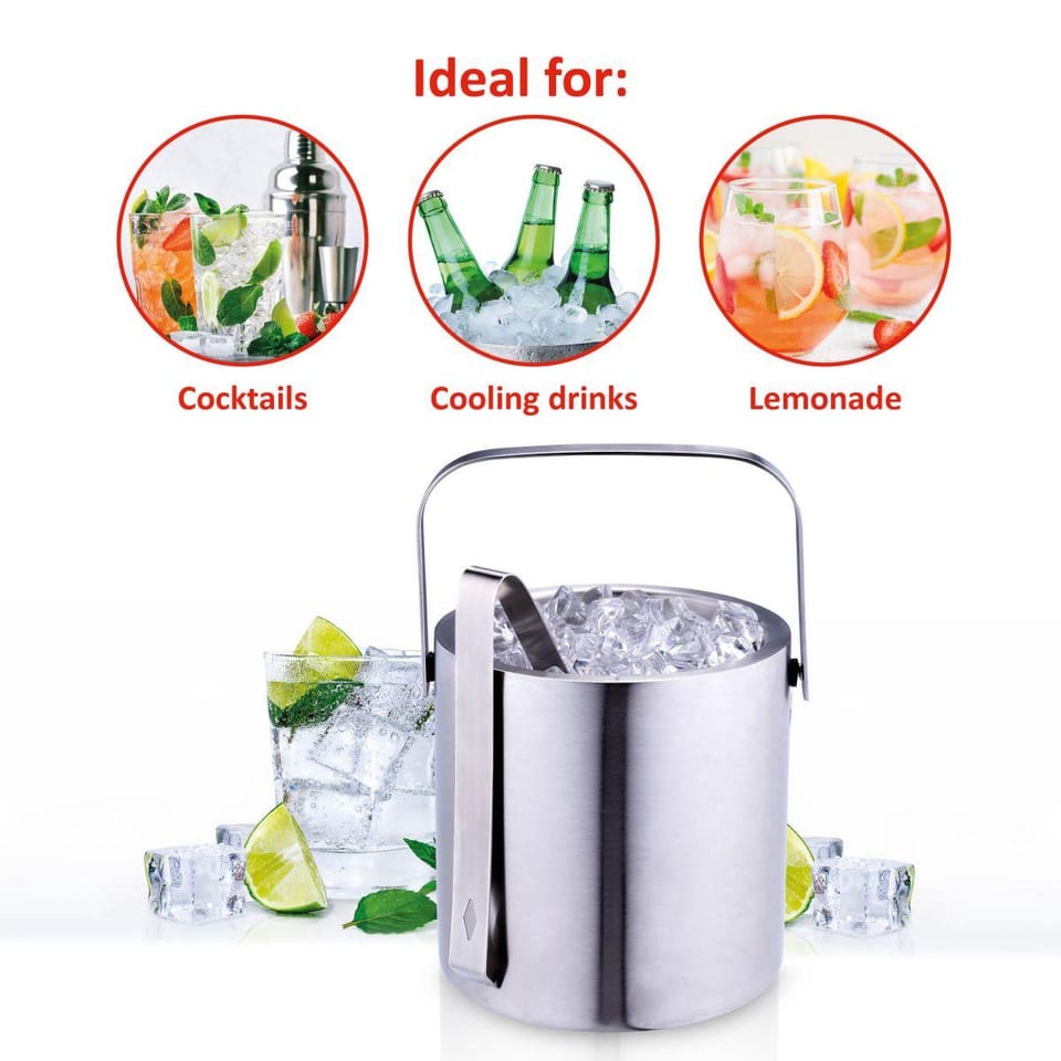 - wykonanE ze stali nierdzewnejwyjątkowo trwałe i odporneo poj. 1,2 Lwielokrotnego użytkuz podwójnymi ściankamiw zestawie szczypce do lodu i pokrywkaw eleganckim stylu
