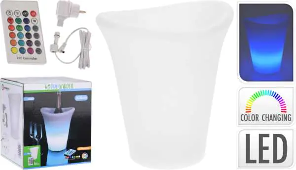 Wiaderko na lód chłodziarka do wina podświetlana LED wielokolorowa z pilotem Wiaderko z atmosferycznym lodem, które można zmienić za pomocą dołączonego pilota. Chłodziarka do wina jest łatwa do ponownego naładowania. Specyfikacja techniczna: Wysokość: 28 cm Pilot z 16 opcjami kolorystycznymi Materiał: polietylen (LLDPE) 12 diod LED (5050 RGB) Adapter IP44 Materiał: Plastikowy Można myć w zmywarce: nie Długość x szerokość: 23 x 26 cm