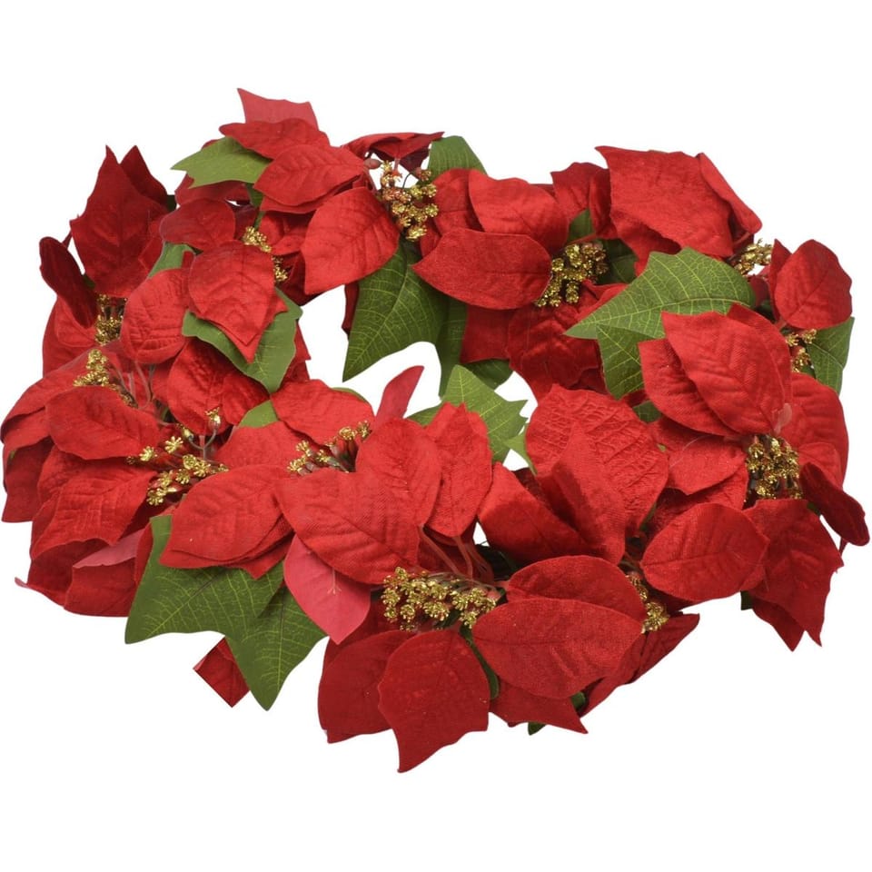 Czerwone płatki i delikatne złote zdobienia nadają wiankowi wyjątkowego charakteru. Wygląda jak świeżo ułożony z naturalnych kwiatów poinsecji (pot. gwiazdy betlejemskiej)