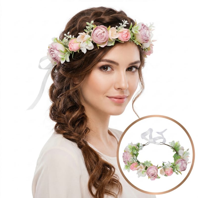 Romantyczny wianek na głowę z wysokiej jakości kwiatów sztucznych.wianek jest uniwersalny, mogą go zakładać zarówno dzieci, jak i dorosłe osoby. Idealny dodatek na wyjątkowe okazje jak i na co dzień.