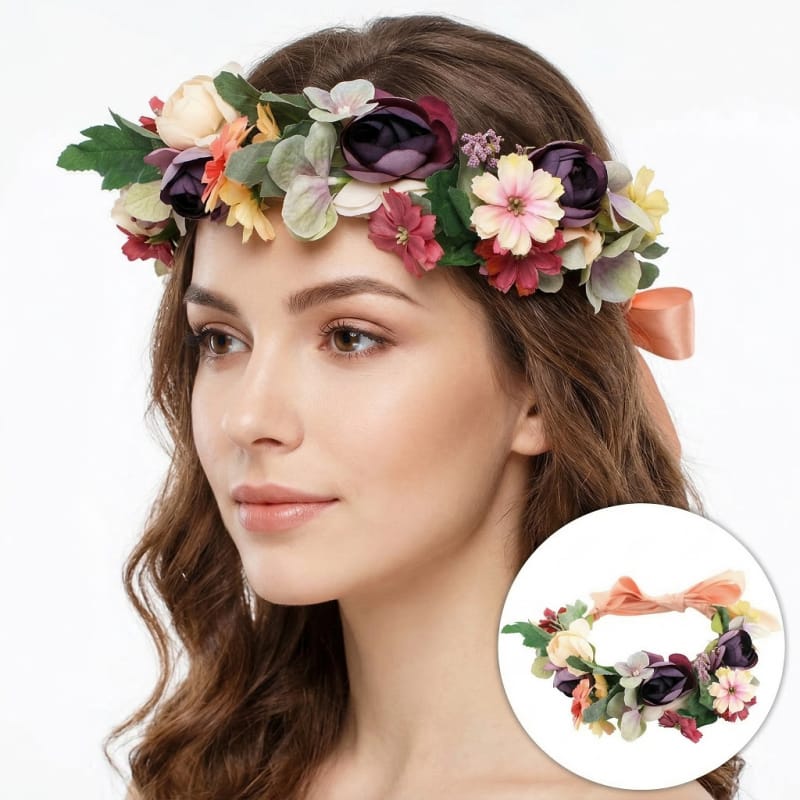 Romantyczny wianek na głowę z wysokiej jakości kwiatów sztucznych.wianek jest uniwersalny, mogą go zakładać zarówno dzieci, jak i dorosłe osoby. Idealny dodatek na wyjątkowe okazje jak i na co dzień.Wymiary:wianek: 35 cm plusz wstążki do mocowania i regulacji