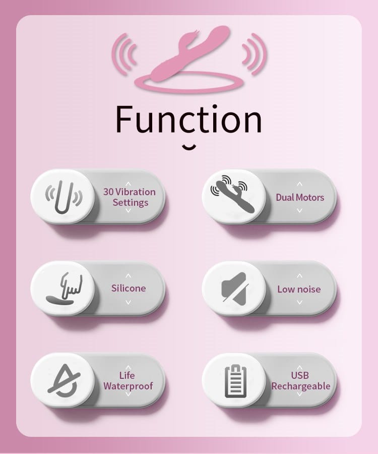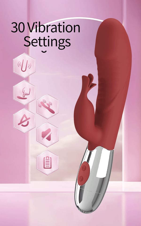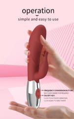 Ten wibrator z podwójnym silnikiem wykonano z jedwabiście gładkiego silikonu. Zaokrąglona główka łatwo trafia w punkt G dzięki wygiętemu, elastycznemu trzonowi, który dopasowuje się do najbardziej intymnych krzywizn ciała, a zewnętrzne „królicze uszka” delikatnie masują łechtaczkę, zapewniając połączoną stymulację i wyjątkowo intensywne doznania. Obie części wibrują jednocześnie w 30 wzorach, więc szybko znajdziesz tryb, który stanie się Twoim ulubionym.