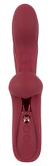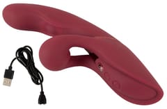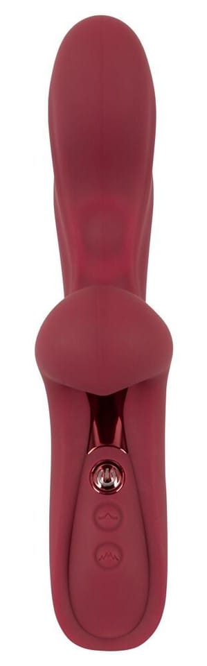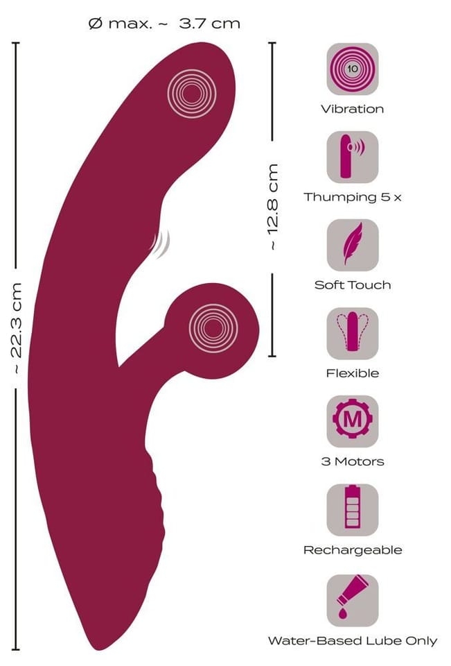 Elegancki 2-funkcyjny wibrator marki Javida. Wyposażony w funkcję pulsowania zapewnia jednoczesną przyjemność wewnętrzną i zewnętrzną! Jego cudownie ukształtowany, pulsujący trzon z wibrującą końcówką sprawia przyjemność głęboko w pochwie. Wibrujące ramię w kształcie kuli niezwykle intensywnie stymuluje łechtaczkę. 3 ciche, ale mocne silniki zapewniają niezawodną moc podczas podwójnej stymulacji. Połączone wibracje w zakrzywionej końcówce i elastycznym kulkowym stymulatorze łechtaczki mają 10 trybów. Funkcja pulsowania (uderzania) w dużym falistym trzonie jest dostępna w 5 trybach, dzięki czemu idealnie nadaje się do wielu różnorodnych zastosowań. Obie funkcje można łatwo i oddzielnie kontrolować za pomocą przycisków na zabawce. Dzięki aksamitnie miękkiej silikonowej powierzchni wibrator można łatwo wsunąć. Jest cudownie elastyczny, co oznacza, że idealnie dopasowuje się do ciała i jego ruchów podczas stymulacji. Ładowanie za pomocą dołączonego magnetycznego kabla USB.Całkowita długość 22,3cm.Długość użytkowa 12,8cmŚrednica 3,7 cmWaga 266 g.Materiał: silikon, PU, ABS.