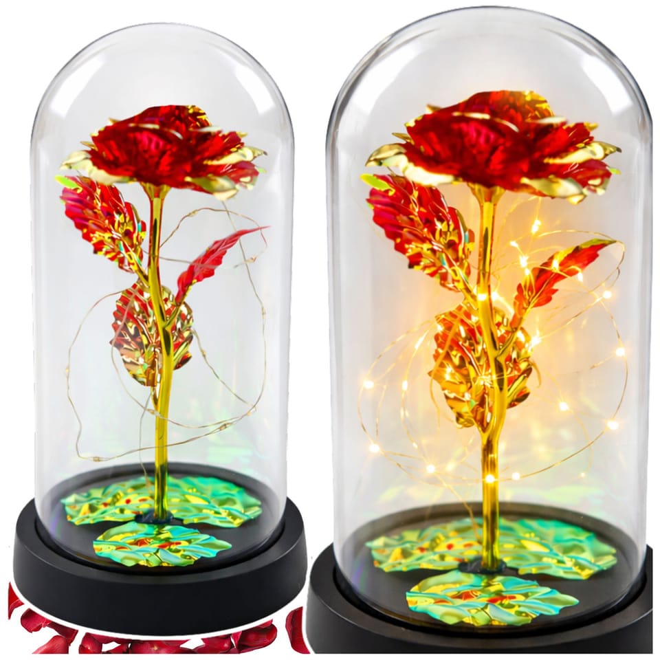 ⭐ ZAWARTOŚĆ ZESTAWU✅ Wieczna czerwona róża w kopule✅ Lampki LED✅ Plastikowa podstawka✅ Prezentowe pudełko