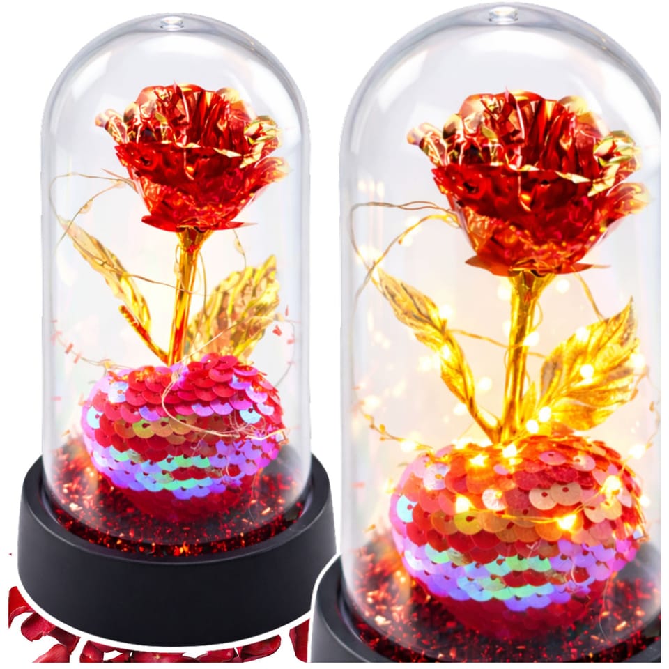 ⭐ Wieczna Róża Kryształowa w Kopule z Oświetleniem LED – Czerwona z Serduszkiem i Konfetti ⭐