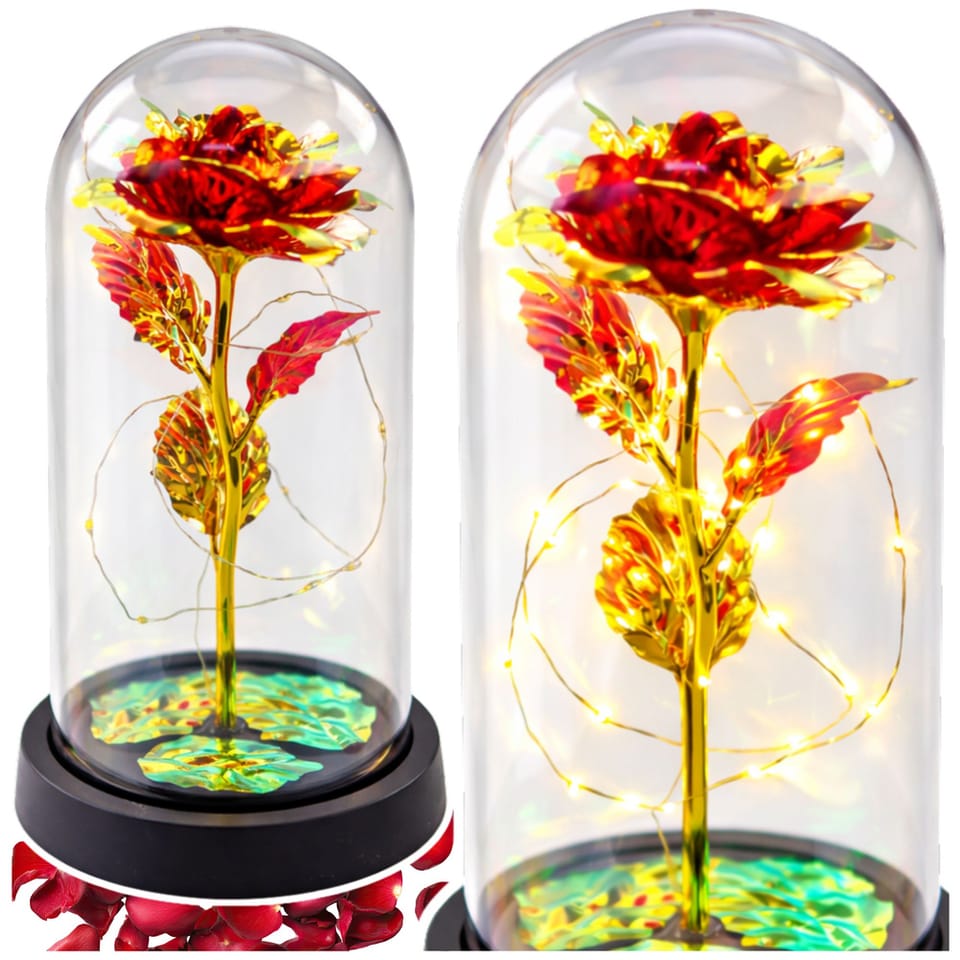 ? SPECYFIKACJA?? Wymiary kopuły: 11 cm x 21 cm?? Źródło zasilania: 3 x AAA (baterie nie są dołączone)?? Materiał róży: Wysokiej jakości tworzywo sztuczne?? Podstawka: Plastik?? Oświetlenie: 20 diod LED o ciepłym białym świetle?? Opakowanie: Prezentowe pudełko?? Wymiary opakowania: 22 cm x 12 cm x 12 cm?? Kolor róży: Czerwony