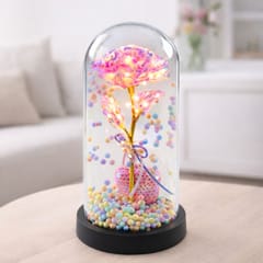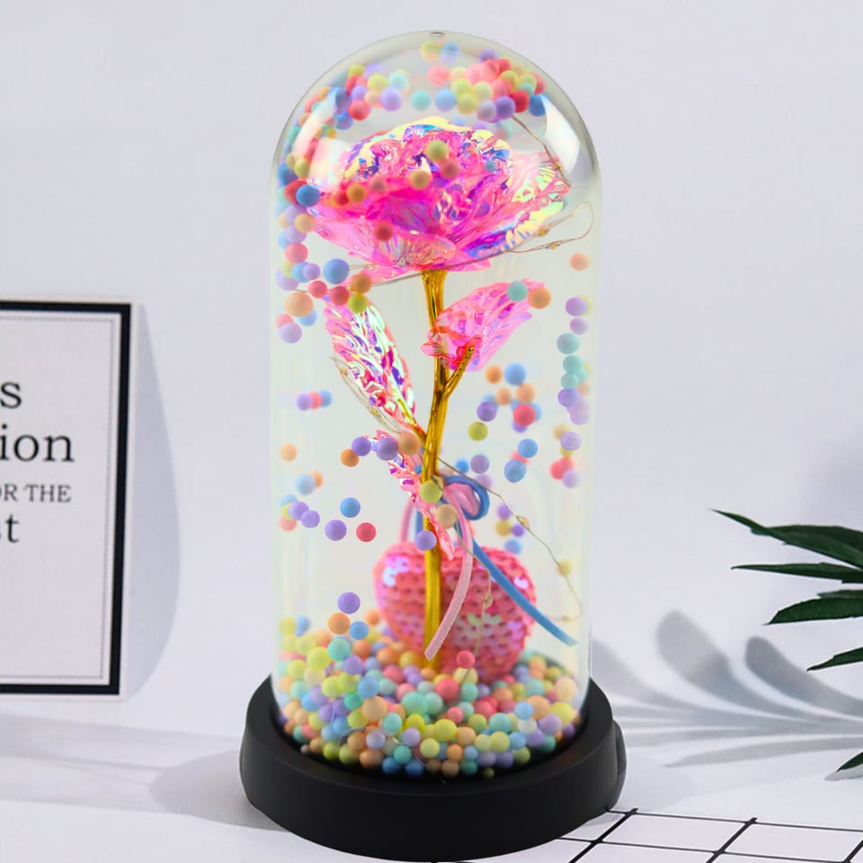 Wieczna kryształowa róża w kolorze różowym z serduszkiem i kolorowymi kuleczkami, umieszczona w eleganckiej kopule z delikatnym oświetleniem LED, to wyjątkowy i symboliczny prezent, który doda niepowtarzalnego charakteru każdemu wnętrzu. Subtelne światło LED tworzy magiczną atmosferę, idealną na romantyczne okazje.
