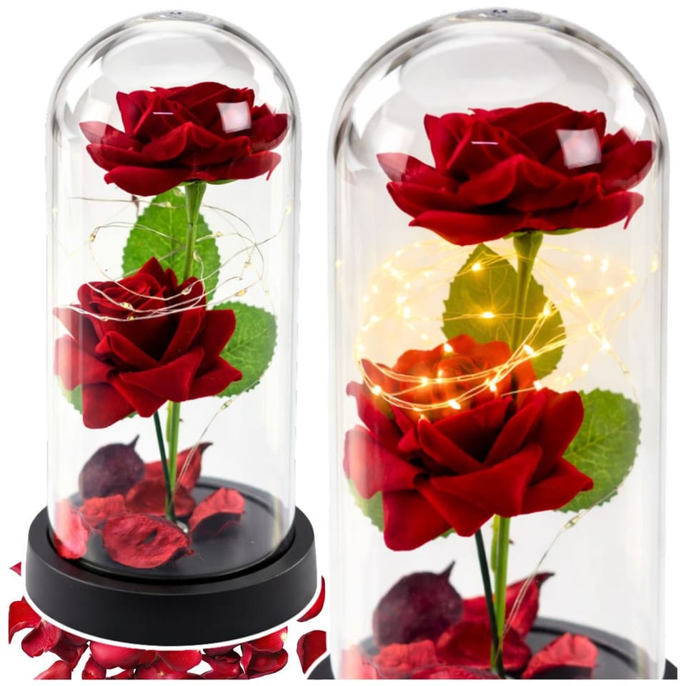 ⭐ Wieczne Róże w Kopule z Oświetleniem LED i Płatkami Róż - Czerwone ⭐Wieczne róże w kopule z oświetleniem LED to elegancki i symboliczny prezent, który wyrazi Twoje uczucia i doda wyjątkowego charakteru każdemu wnętrzu. W kopule znajdują się dwie sztuczne róże, a w przestrzeni kopuły unoszą się płatki róż, które w połączeniu z subtelnym światłem LED tworzą niepowtarzalną atmosferę, idealną na romantyczne okazje.