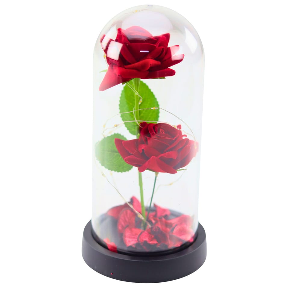 Wieczne 2 Róże w Kopule z Oświetleniem LED i Płatkami Róż Czerwone 21x11cm
