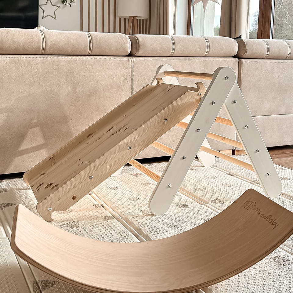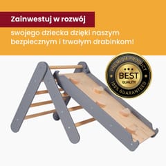 Cała konstrukcja zestawu jest bardzo stabilna, lekka i bezpieczna. Zarzuć na naszą trójkątną drabinkę niewielki koc, a stworzysz najmłodszym domownikom kryjówkę w postaci uwielbianego przez dzieci namiotu tipi. Wysokie walory estetyczne sprawią, że zabawka będzie zapewne podkreślała elegancję każdego dziecięcego pokoju. Dzięki zabezpieczeniu drewna przez ekologiczne farby, ulubiona drabinka oraz zjeżdżalnia Twego dziecka na długo zachowa piękny naturalny wygląd. Każde dziecko pokocha domowy plac zabaw.Przy pomocy drewnianej drabinki gimnastycznej Twoje dziecko stworzy swój domowy plac zabaw. Stabilna konstrukcja z 9-cioma szczebelkami zaangażuje dziecko do wykonywania prostych ćwiczeń fizycznych ważnych w początkowym okresie rozwoju motoryki Twojego dziecka. Zestaw dla dzieci do pokoju stanowi świetne ćwiczenie dla starszaków, jak i ciekawe urozmaicenie dla maluszków. Świetnie wypełni dziecięcy czas zabawy w pokoju bez względu na pogodę.