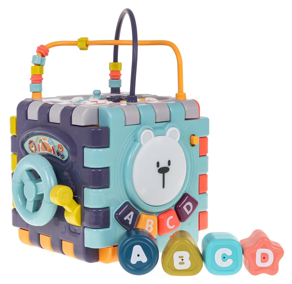 | Wielofunkcyjna interaktywna kostka z efektami dźwiękowymi i świetlnymi dla dzieci od 18-go miesiąca życia. Każda ścianka boxu zapewni dziecku wiele frajdy i interaktywnej zabawy. Efekty dźwiękowe i świetlne oraz bogactwo kolorów, przyciągnie wzrok maluszka i zachęci do zabawy. Kostkę możemy rozkładać i bawić się poszczególnymi elementami na płasko. Zabawka zasilana jest bateriami typu 3 x AAA 1,5 V (brak w zestawie). Opis ścianek boksu:- ścianka z ruchomą kierownicą i ruchomą skrzynią biegów.Maluszek może poruszać kierownicą i atrapą drążka zmiany biegów.- interaktywna ścianka z misiem i przyciskamiNaciskając na misia, miś się podświetla i słyszymy dźwięki. Pod głową misia mamy również cztery przyciski z literkami A, B, C, D, które po naciśnięciu grają różne melodie lub uczą literek (w języku angielskim).- ścianka z sorterem kształtów4 kształty i 4 klocuszki w zestawie.- ścianka z przekładaną książeczką i pałąkiem z ruchomymi elementami- ścianka z telewizorem i suwakiem- górna ścianka z kołami zębatymi i przekładankami Funkcje zestawu:- przeznaczona dla dzieci od 18-go miesiąca życia,- wykonana z najlepszej jakości plastiku w żywych kolorach,- boks złożony z 6 ścian, puzzli, - możliwość spinania w dowolnym układzie puzzli,- ścianka interaktywna z efektem światła (podświetlana głowa misia) i dźwięku (klawisze z numerkami i miś),- ruchome elementy: kierownica, dźwignia zmiany biegów, suwak, koła zębate, przekładane strony książki,- sorter kształtów z klockami,- klocki z grzechotką w środku. | |