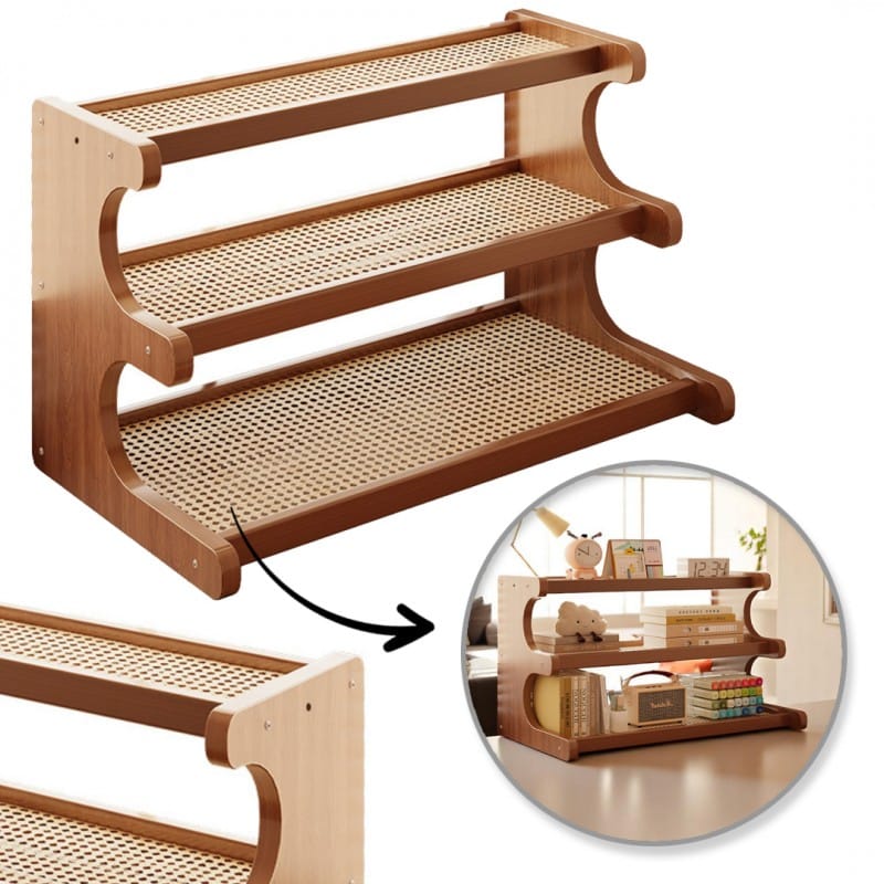 Praktyczny 3-poziomowy regał na książki i przybory biuroweJeśli brakuje Ci miejsca na biurku, ten regał jest dla Ciebie! Specyfikacja:- Posiada 3 poziomy, na którym swobodnie poukładasz niezbędne przedmioty.- Wysokość półek - 18 cm- Rama wykonana z wysokiej jakości bambusa i płyty MDF o dużej gęstości- Blaty z plastikowego plecionego rattanu- Produkt do samodzielnego montażu. Wymiary po złożeniu:19 cm x 50 cm x 31 cm Wymiary opakowania jednostkowego:50cm x 20cm x 4cm Waga produktu:880g netto / 1,1kg brutto