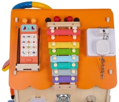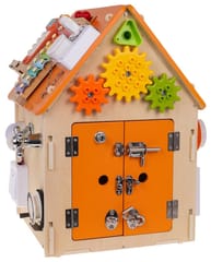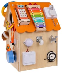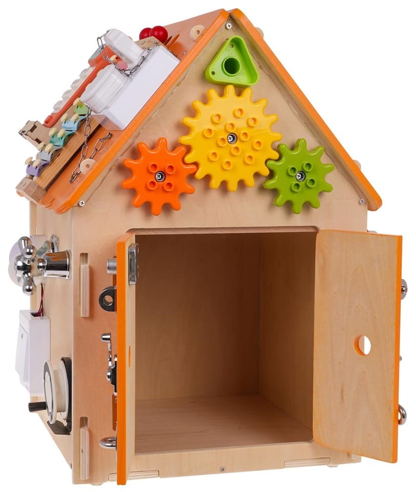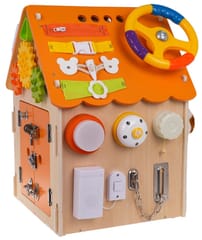 Wielofunkcyjny, drewniany domek z interaktywnymi funkcjami i zabawkami manipulacyjnymi. Na domku znajduje się aż 29 różnych atrakcji. Zabawka jest przeznaczona dla dzieci od 3-go roku życia. Konstrukcja wykonana jest z drewna i została pomalowana nietoksycznymi farbami. Solidne wykonanie i zaokrąglone krawędzie zapewniają bezpieczeństwo podczas zabawy. Oprócz drewnianego domku, w zestawie znajduje się wyjmowany telefon i plastikowa śruba z nakrętką. Domek posiada oświetlenie LED ukryte pod daszkiem. Poszczególne elementy, jak dzwonki, pozytywka i telefon posiadają funkcje dźwiękowe. Interaktywne funkcje są zasilane bateriami 7 x AAA 1,5V (w zestawie). Zabawa domkiem wszechstronnie rozwija dzieci i uczy posługiwania się popularnymi elementami codziennego użytku. Zabawki na dachu: - kolorowa, skrętna kierownica, - zamek błyskawiczny, - klamra z zatrzaskiem, - kołek z pętelką do zapięcia, - pasek z klamrą, - wyjmowany telefon z zielonym światełkiem i wesołymi dźwiękami pod każdym przyciskiem, - kolorolowe, metalowe cymbałki z 2 drewnianymi pałeczkami, - 2 wtyczki do kontaktów na łańcuszkach. Zabawki na ścianach przedniej i tylnej: - dzwon tradycyjny, - spinner do obracania, - drewniana kołatka, - pluszowy chomik z funkcją wibracji po naciągnięciu sznurka, - drewniany zegar wskazówkowy w kształcie królika z ruchomymi wskazówkami, - kołek z przyciskiem i mechanizmem przeskakiwania, - nakręcana pozytywka, - guziki do zapięcia i zamek błyskawiczny na filcowej kurteczce, - 3 koła zębate różnej wielkości, - otwierane drewniane drzwi z kluczami i 3 rodzajami zasuwek, - taśma ze światełkami LED z dotykowym włącznikiem. Zabawki na ścianach bocznych: - kurek od kranu do obracania, - kołowrotek z korbką i mechanizmem do kręcenia (podczas kręcenia słychać dźwięk przeskakiwania), - kółko meblowe, obrotowe o 360 stopni, - włącznik światła z lampką, - duży przycisk wydający odgłos klikania, - dzwonek recepcyjny, - mechanizm klikający ze sznurkiem, - zasuwka, - dzwonek elektryczny do drzwi. Specyfikacja: - domek z 29 zabawkami manipulacyjnymi, - osobno w zestawie wyjmowany telefon i śruba z nakrętką, - funkcje dźwiękowe w telefonie, dzwonku i pozytywce, - światełka LED pod daszkiem, - domek wykonany z drewna malowanego nietoksycznymi farbami, - stabilna konstrukcja i zaokrąglone krawędzie dla bezpieczeństwa, - przeznaczony dla dzieci od 3-go roku życia.