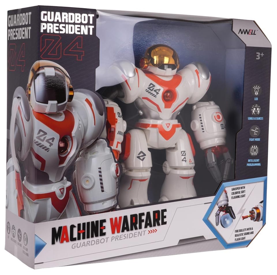 Zdalnie sterowany robot z interaktywnymi funkcjami. Zabawka przeznaczona dla dzieci od 3-go roku życia. Robot został wykonany z wysokiej jakości tworzywa sztucznego i jest w pełni bezpieczny dla najmłodszych. Robotem steruje się za pomocą pilota RC z zestawu. Podczas zabawy robot wykonuje ruchy rękami i nogami, a także wydaje odgłosy i ma podświetlone ręce. Robot posiada ruchome szczypce w lewym ramieniu, a w prawym ma działające wyrzutnie strzałek. W zestawie jest 5 strzałek z bezpieczną, gumową końcówką. Wśród funkcji robota jest jeżdżenie, chodzenie, tryb DEMO, tańczenie, mówienie w robotycznym języku oraz możliwość zaprogramowania ruchów robota w spersonalizowany układ. Na pilocie można też ustawić głośność zabawki. Robot jest zasilany akumulatorem 3,7V (w zestawie), pilot jest zasilany bateriami 2 x AA 1,5V (brak w zestawie). Specyfikacja: - zdalnie sterowany robot dla dzieci od 3-go roku życia, - funkcje chodzenia, jeżdżenia, podnoszenia i opuszczania ramion, sterowane z pilota RC, - 2 prędkości robota ustawiane z pilota, - prawe ramię z działającą wyrzutnią strzałek z zestawu, - strzałki zakończone miękką gumą, - lewe ramię z ruchomymi szczypcami, - funkcje tańca, walki, mówienia w robotycznym języku, włączane z pilota, - tryb DEMO, prezentujący wszystkie możliwości robota, - funkcja programowania sekwencji ruchów robota, - tryb czuwania włączany przyciskiem na środku robota, - kolorowe lampki LED podświetlające wyrzutnię i szczypce, - efekty dźwiękowe przy każdym ruchu, - zmiana głośności zabawki ustawiana z pilota, - ręcznie otwierany złoty kask na głowie robota.