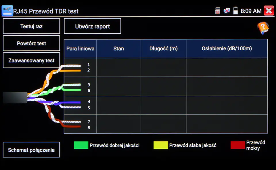 | Reflektometr tdr: | Wykrywanie i lokalizacja miejsca przerwania kabla (tylko UTP) |
