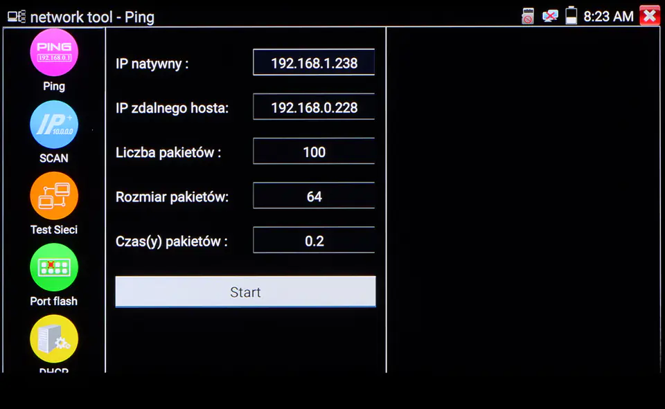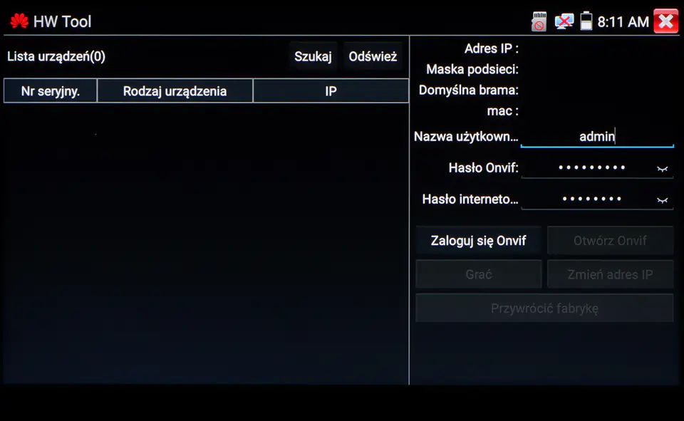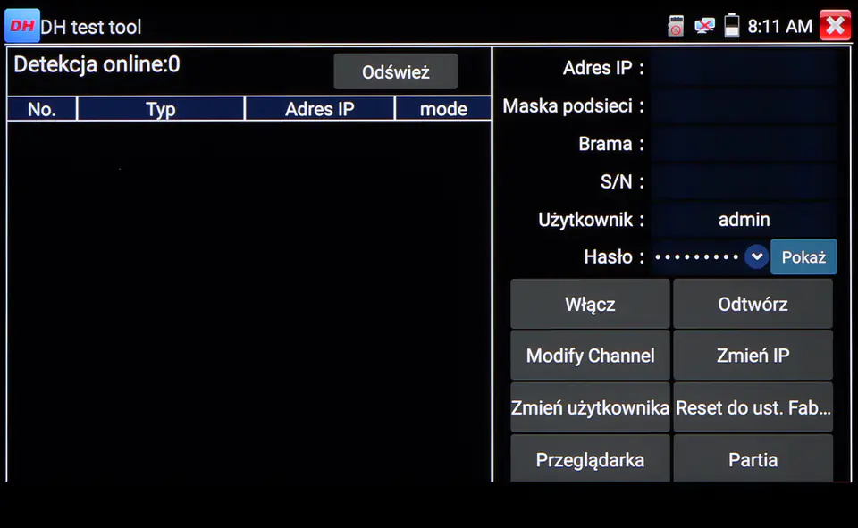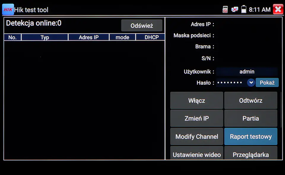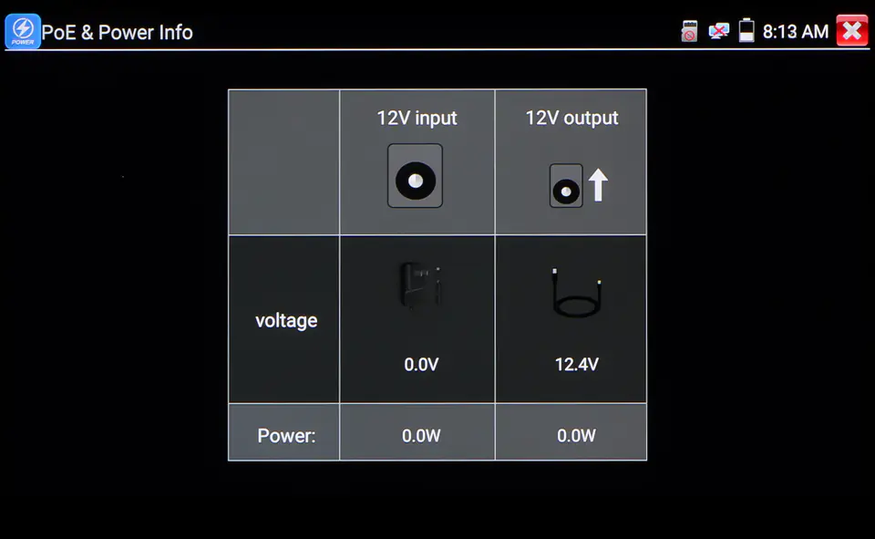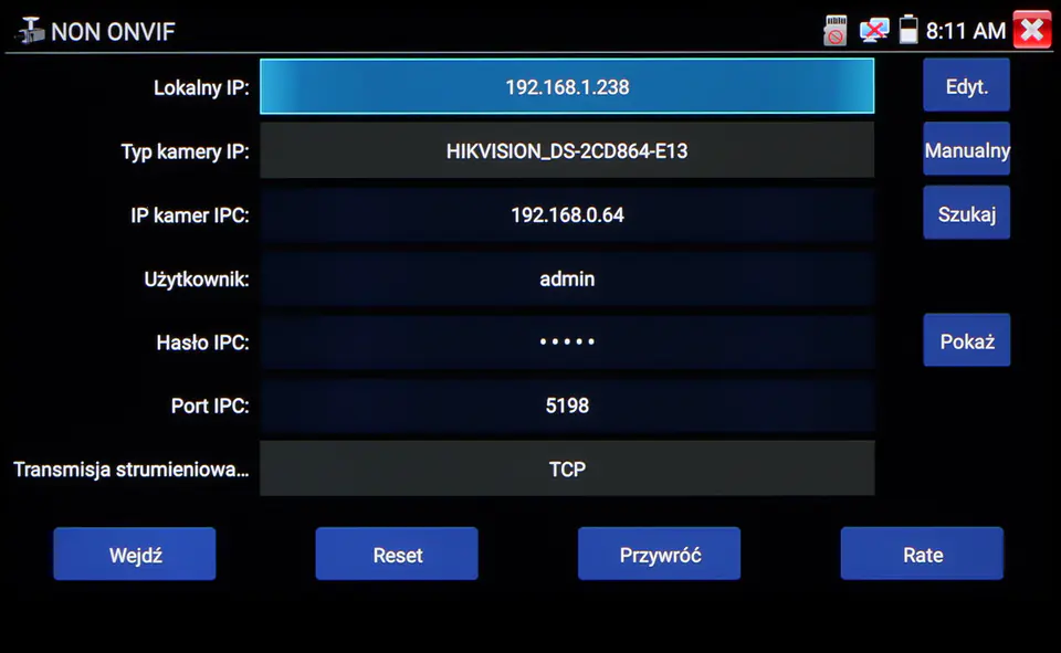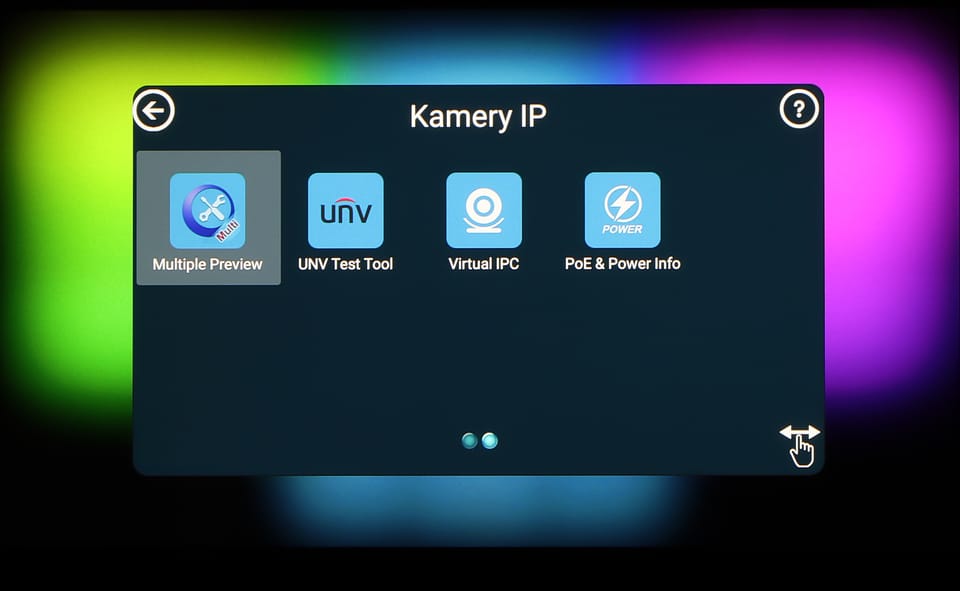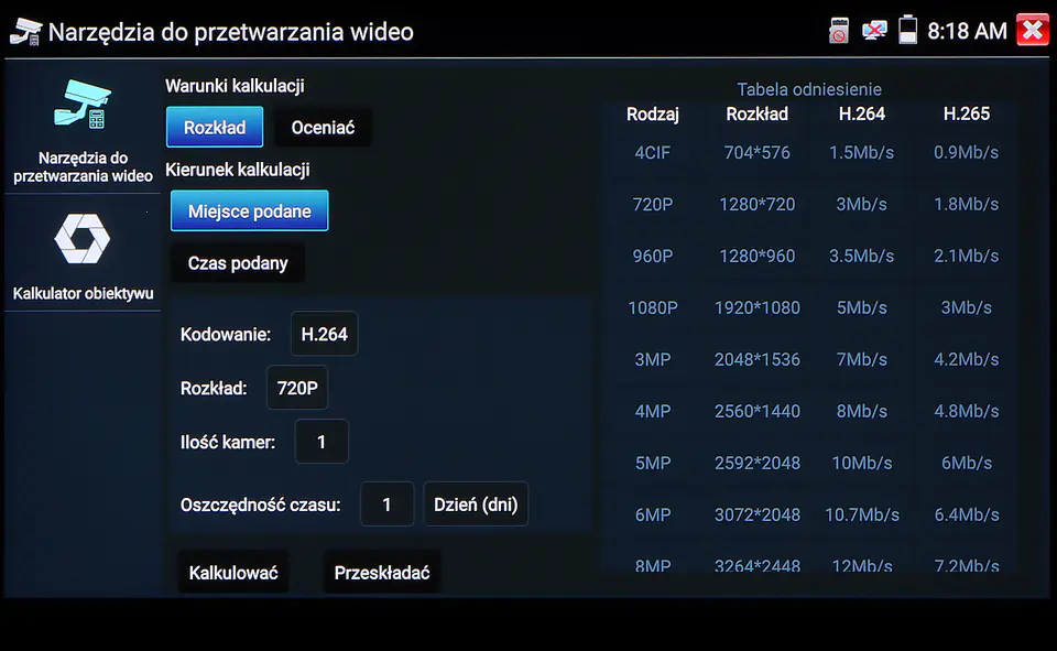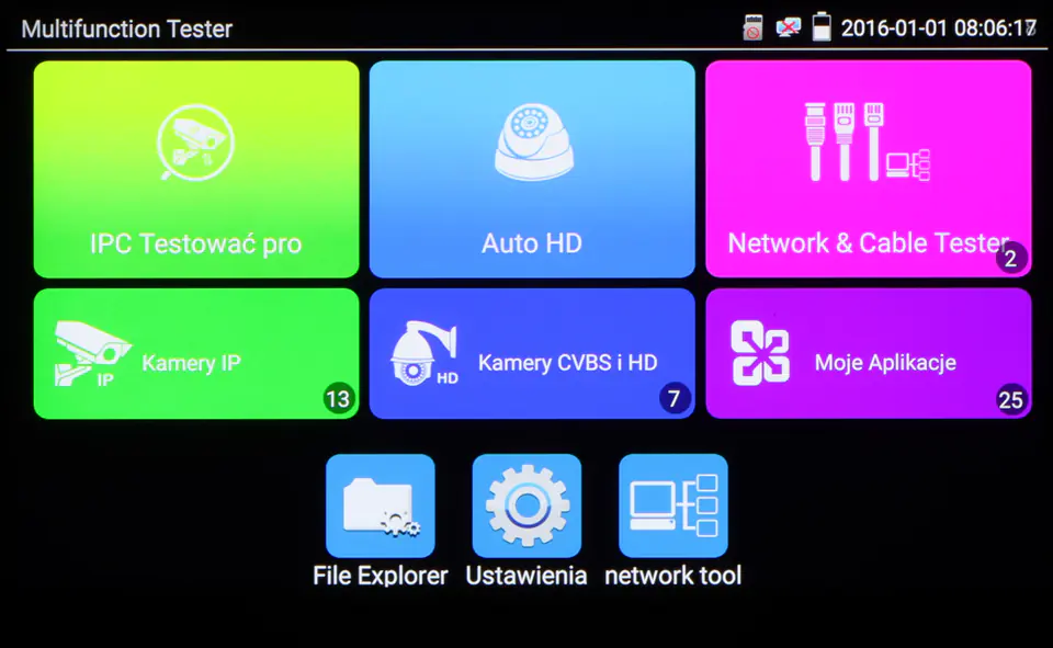 | Wybrane funkcje: | Test kamer AHD Test kamer HD-CVI Test kamer HD-TVI Test kamer PAL/NTSC Test kamer IP - Obsługiwane metody kompresji obrazu : H.265, H.264 Obsługa formatu : 5 Mpx, 16 : 9 HD-CVI, DAHUA Wyszukiwanie i podgląd kamer IP zgodnych z Onvif Wirtualny IPC Kalkulator Bitrate DH test tool Hik test tool UNV Test Tool HuaWei Tool Sterowanie obrotnicami i kamerami PTZ (speed dome) Podgląd z kamer IP za pomocą wbudowanych aplikacji - iVMS-4500 HD, EZView, gDMSS HD Lite, XMEye, Tiandy tool, Quotation tool Wbudowana przeglądarka internetowa - Google Chrome Monitorowanie połączeń LAN Skaner adresów IP PING - testowanie łącza za pomocą pakietów ICMP Wykrywanie podłączonego portu w switchu Tester skrętki komputerowej Współpraca z kamerami i switchami PoE Miernik zasilania PoE Źródło zasilania DC 12V / 48V Data monitor - monitor portu szeregowego RS-485 Test audio Hotspot - Wi-Fi Zapis wideo na kartę micro SD z możliwością odtwarzania (brak w zestawie) Tester Play - projekcja ekranu: jednocześnie tester, telefon komórkowy i komputer Odtwarzanie nagrań Kalkulator Wbudowana latarka |