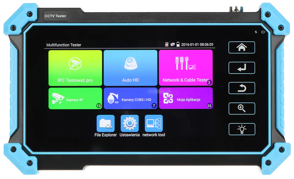 Wielofunkcyjny tester kamer AHD, HD-CVI, HD-TVI, IP, kamer analogowych, Speed Dome (PTZ), wyposażony w wiele dodatkowych funkcji, niezbędnych przy uruchamianiu instalacji CCTV