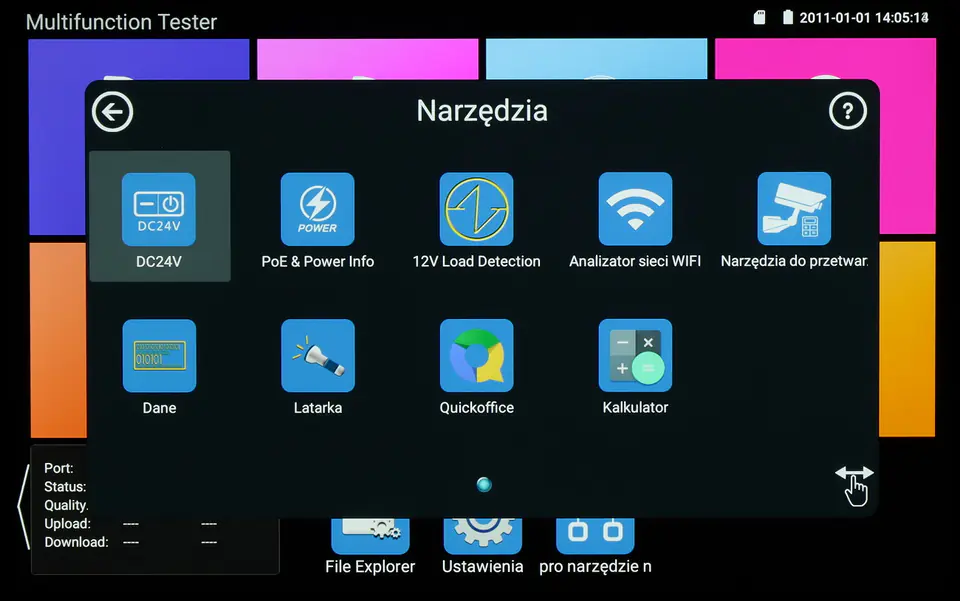 | Wybrane funkcje: | Test kamer AHD Test kamer HD-CVI Test kamer HD-TVI Test kamer PAL/NTSC Test kamer IP - Obsługiwane metody kompresji obrazu : H.265, H.264, MJPEG Wyszukiwanie i podgląd kamer IP zgodnych z Onvif Sterowanie obrotnicami i kamerami PTZ (speed dome) Podgląd z kamer IP za pomocą wbudowanych aplikacji - CloudSEE, Safire EasyView, XMEye, Tiandy tool, EZView, BitVision, DMSS, Hik-Connect, DoLynk Care Wbudowana przeglądarka internetowa - Google Chrome Generator sygnału kontrolnego Monitorowanie połączeń LAN Skaner adresów IP PING - testowanie łącza za pomocą pakietów ICMP Wykrywanie podłączonego portu w switchu Tester skrętki komputerowej Współpraca z kamerami i switchami PoE Miernik zasilania PoE Źródło zasilania DC 5V / 12V / 48V Data monitor - monitor portu szeregowego RS-485 Test audio Analizator sieci Wi-Fi Hotspot - Wi-Fi Zapis wideo na kartę micro SD z możliwością odtwarzania - 8 GB w zestawie Odtwarzanie nagrań Kalkulator Wbudowana latarka Podświetlane przyciski |