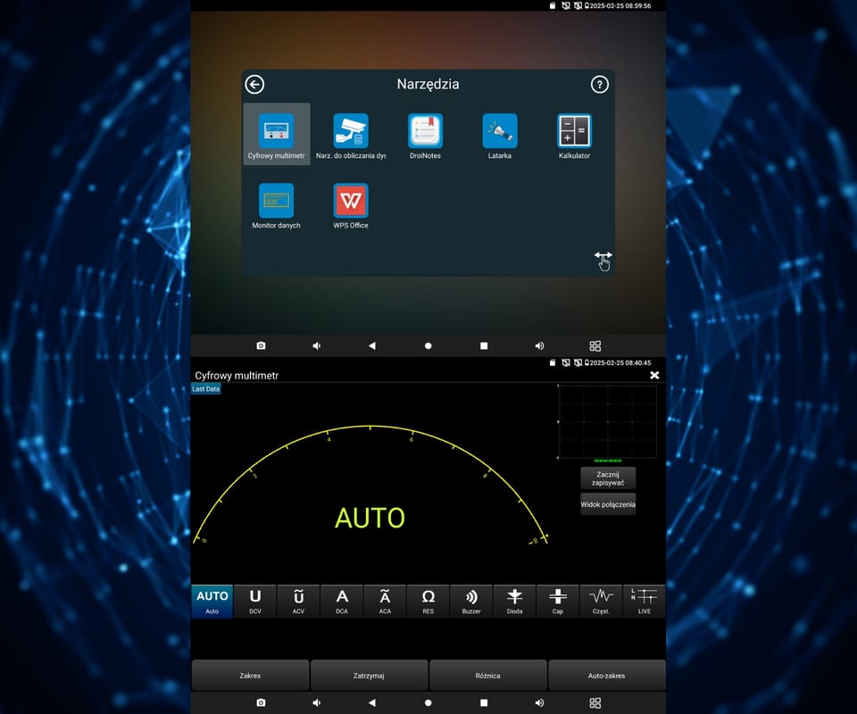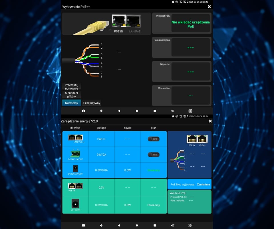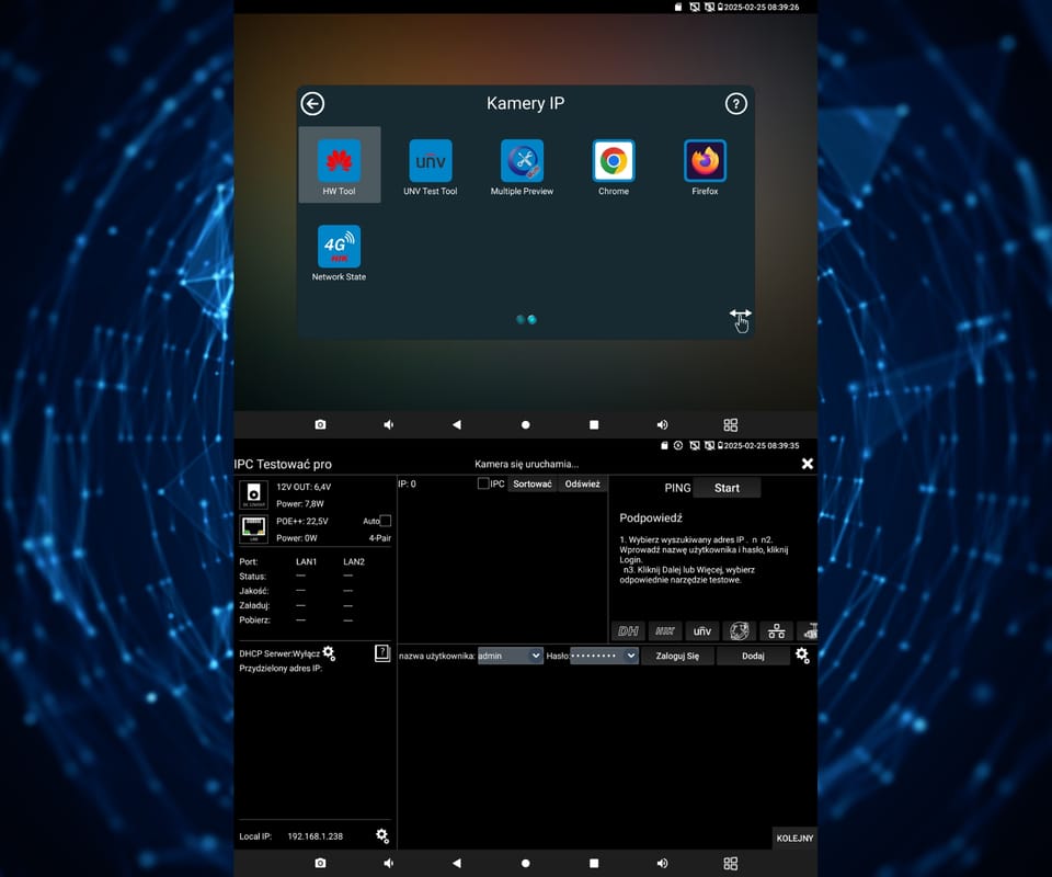 | Wybrane funkcje: | Test kamer AHD Test kamer HD-CVI Test kamer HD-TVI Test kamer PAL/NTSC Test kamer IP - Obsługiwane metody kompresji obrazu : H.265, H.264, MJPEG Wyszukiwanie i podgląd kamer IP zgodnych z Onvif Sterowanie obrotnicami i kamerami PTZ (speed dome) Podgląd z kamer IP za pomocą wbudowanych aplikacji - gDMSS HD Lite, gDMSS Lite, Safire Connect, Network State, XMEye, CloudSEE Tiandy tool, Fseye, EZView, FreeIP PRO, iVMS-4500 HD Safire EasyView, MEye Wbudowana przeglądarka internetowa - Google Chrome Generator sygnału kontrolnego Monitorowanie połączeń LAN Skaner adresów IP PING - testowanie łącza za pomocą pakietów ICMP Wykrywanie podłączonego portu w switchu Tester skrętki komputerowej Współpraca z kamerami i switchami PoE Miernik zasilania PoE Źródło zasilania DC 5V / 12V / 48V Identyfikacja przewodu w wiązce Reflektometr TDR Miernik mocy optycznej VLS (VFL) - wizualny lokalizator uszkodzeń włókien światłowodowych Digital Multimeter - multimetr cyfrowy Data monitor - monitor portu szeregowego RS-485 Aplikacja Cable tracer - łatwa lokalizacja przewodu w nieuporządkowanej wiązce Test audio Hotspot - Wi-Fi Zapis wideo na kartę micro SD z możliwością odtwarzania - 8 GB w zestawie Odtwarzanie nagrań Zainstalowana aplikacja VLC Media Player - możliwość odtwarzania plików multimedialnych w wielu popularnych formatach (.mp3, .mp4, .avi, .mpeg i inne) Kalkulator Zainstalowany pakiet Quickoffice - tworzenie i odczyt dokumentów tekstowych .docx, arkuszy kalkulacyjnych .xlsx oraz prezentacji multimedialnych .pptx Wbudowana latarka Możliwość zmiany wyświetlanego motywu oraz tła Android 11 Podświetlane przyciski |