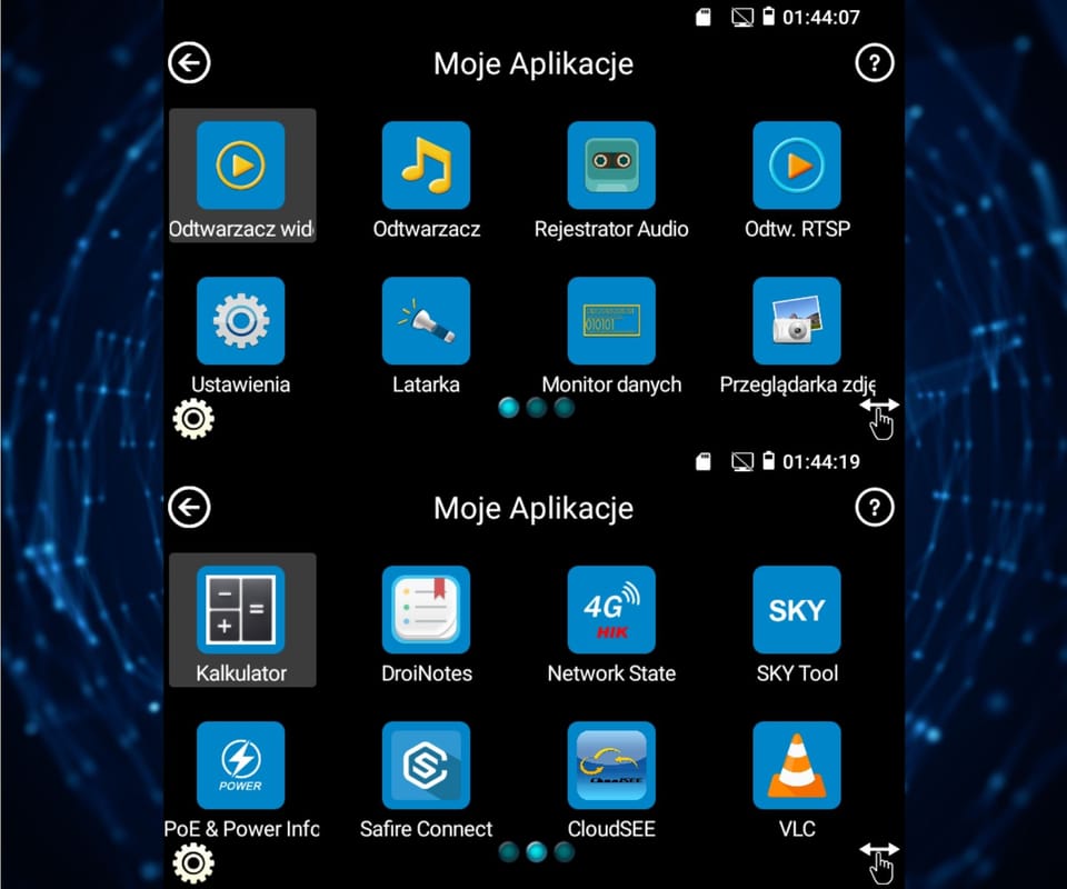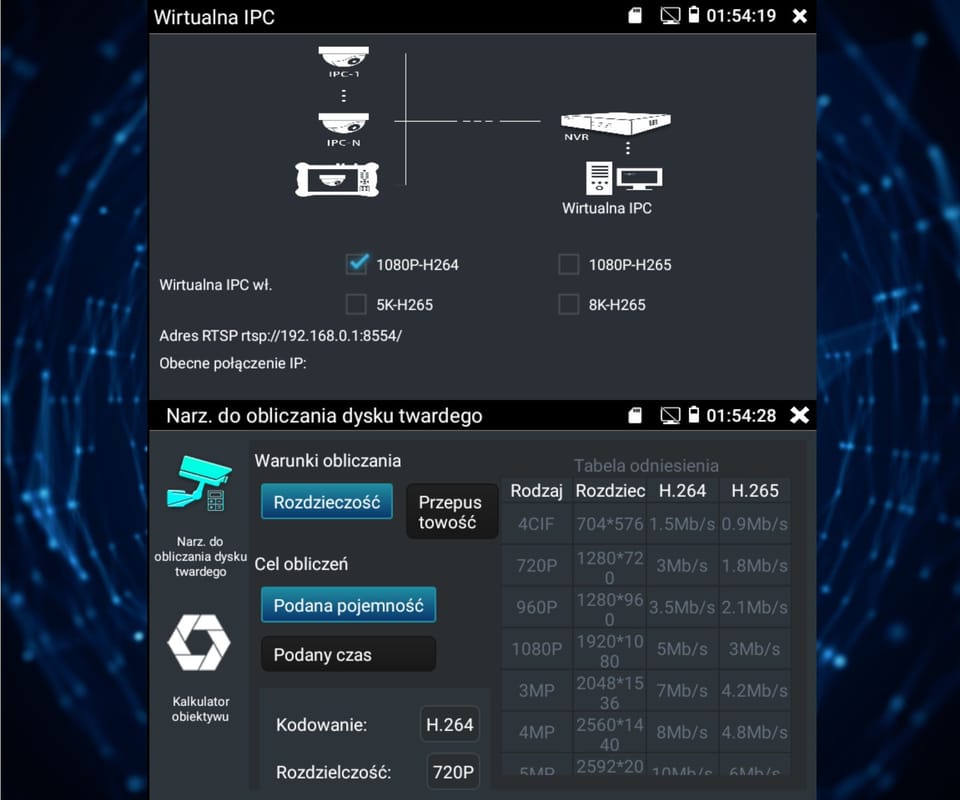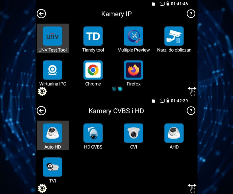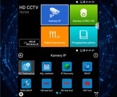 | Wybrane funkcje: | Test kamer AHD Test kamer HD-CVI Test kamer HD-TVI Test kamer PAL/NTSC Test kamer IP - Obsługiwane metody kompresji obrazu : H.265, H.264 Obsługa formatu : 5 Mpx, 16 : 9 HD-CVI, DAHUA Wyszukiwanie i podgląd kamer IP zgodnych z Onvif Wirtualny IPC Kalkulator Bitrate DH test tool Hik test tool UNV Test Tool HuaWei Tool Tiandy tool Sterowanie obrotnicami i kamerami PTZ (speed dome) Podgląd z kamer IP za pomocą wbudowanych aplikacji - iVMS-4500 HD, EZView, Sky tool, XMEye, Safire EasyView, Safire Connect, UNV Test Tool, HW tool, Tiandy tool Wbudowana przeglądarka internetowa - Google Chrome, Firefox Monitorowanie połączeń LAN Skaner adresów IP PING - testowanie łącza za pomocą pakietów ICMP Wykrywanie podłączonego portu w switchu Tester skrętki komputerowej Współpraca z kamerami i switchami PoE Miernik zasilania PoE Źródło zasilania DC 12V / 48V Data monitor - monitor portu szeregowego RS-485 Test audio Hotspot - Wi-Fi Zapis wideo na kartę micro SD z możliwością odtwarzania (brak w zestawie) Tester Play - projekcja ekranu: jednocześnie tester, telefon komórkowy i komputer Odtwarzanie nagrań Kalkulator Wbudowana latarka |