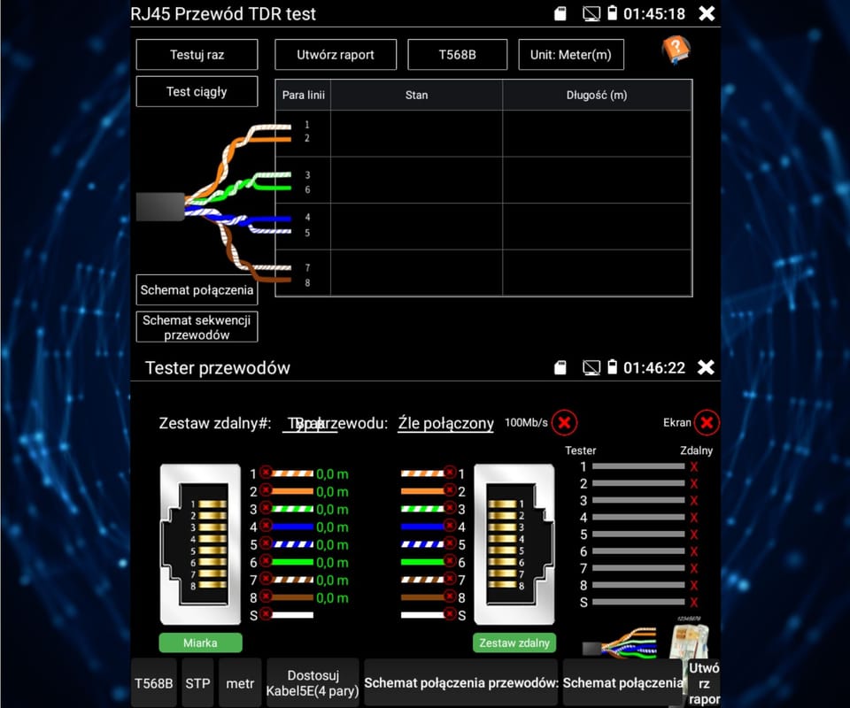 | Reflektometr tdr: | Wykrywanie i lokalizacja miejsca przerwania kabla (tylko UTP) |