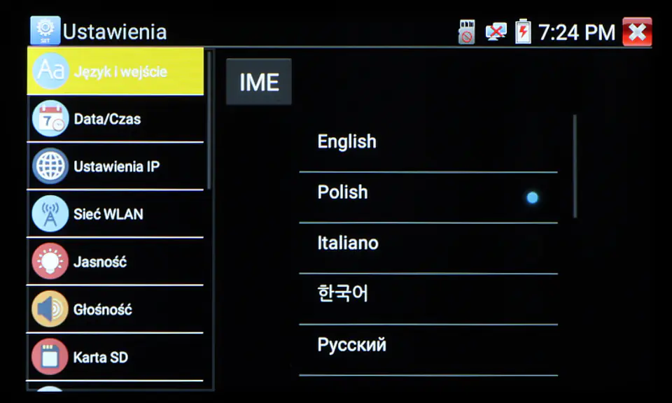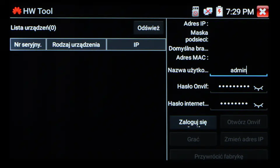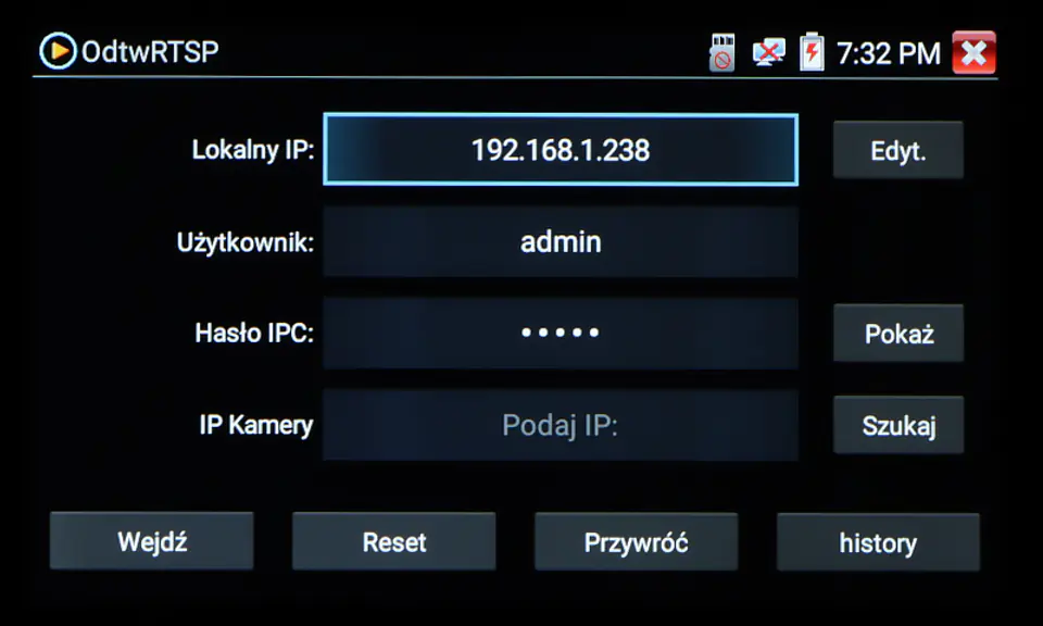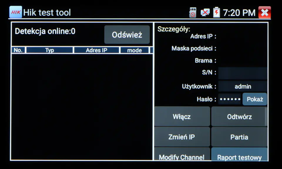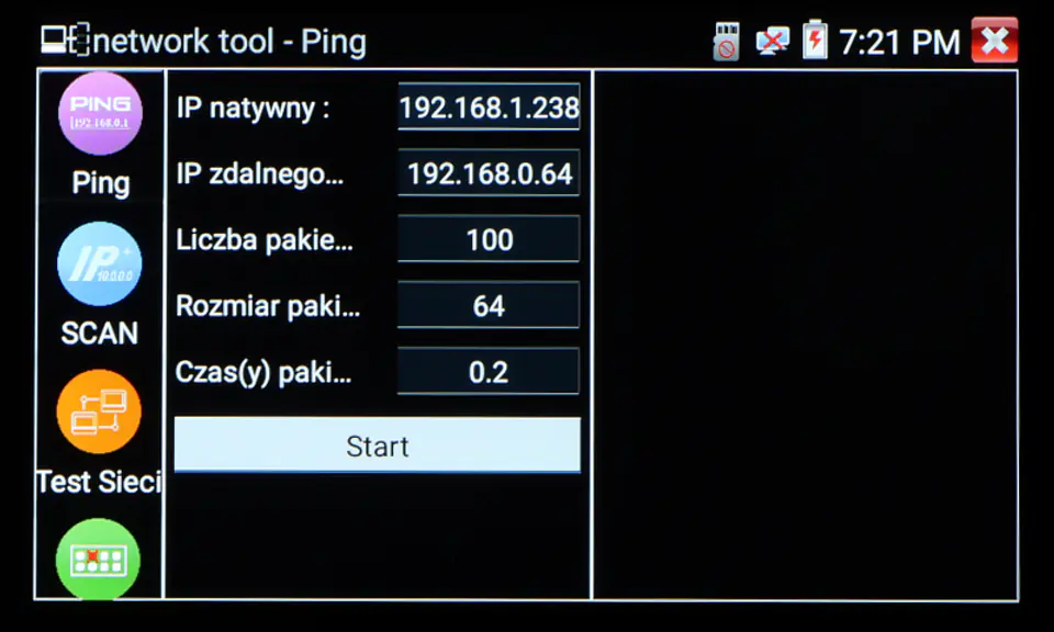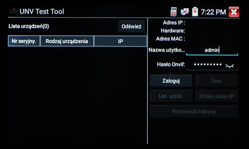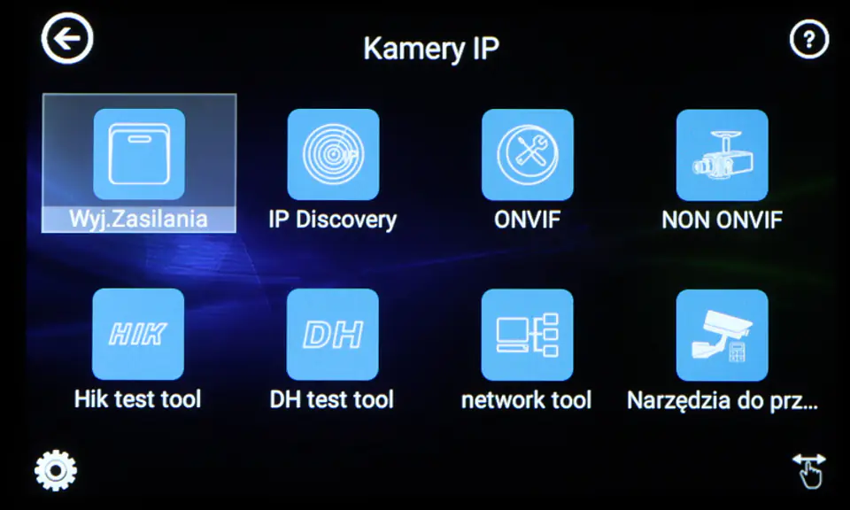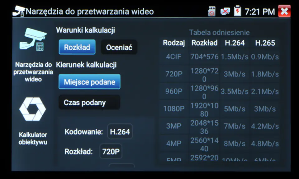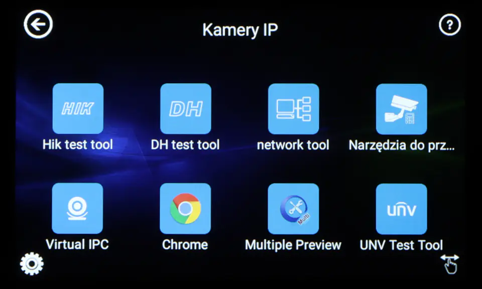 | Wybrane funkcje: | Test kamer AHD Test kamer HD-CVI Test kamer HD-TVI Test kamer PAL/NTSC Test kamer IP - Obsługiwane metody kompresji obrazu : H.265, H.264 Obsługa formatu : 5 Mpx, 16 : 9 HD-CVI, DAHUA Wyszukiwanie i podgląd kamer IP zgodnych z Onvif Wirtualny IPC Kalkulator Bitrate Tiandy tool DH test tool Hik test tool UNV Test Tool HuaWei Tool Sterowanie obrotnicami i kamerami PTZ (speed dome) Podgląd z kamer IP za pomocą wbudowanych aplikacji - iVMS-4500 HD, EZView, gDMSS HD Lite, XMEye, MEye, FreeIP PRO, HW tool, Safire EasyView, Fseye, Tiandy tool Wbudowana przeglądarka internetowa - Google Chrome Monitorowanie połączeń LAN Skaner adresów IP PING - testowanie łącza za pomocą pakietów ICMP Wykrywanie podłączonego portu w switchu Tester skrętki komputerowej Współpraca z kamerami i switchami PoE Miernik zasilania PoE Źródło zasilania DC 12V / 48V Data monitor - monitor portu szeregowego RS-485 Test audio Hotspot - Wi-Fi Zapis wideo na kartę micro SD z możliwością odtwarzania (brak w zestawie) Tester Play - projekcja ekranu: jednocześnie tester, telefon komórkowy i komputer Odtwarzanie nagrań Kalkulator Wbudowana latarka |