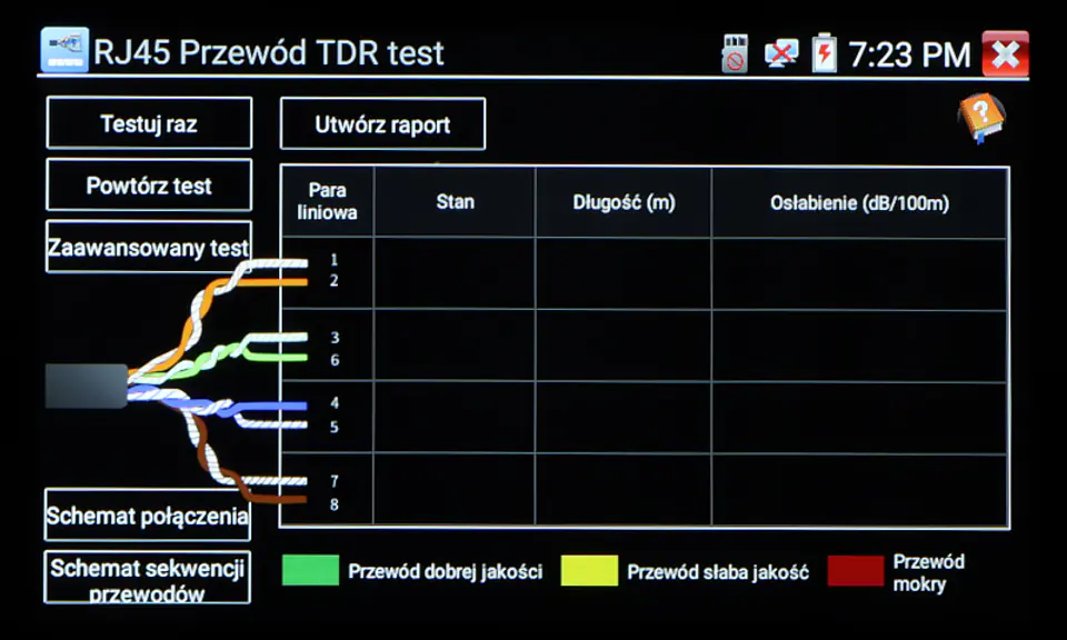 | Reflektometr tdr: | Wykrywanie i lokalizacja miejsca przerwania kabla (tylko UTP) |