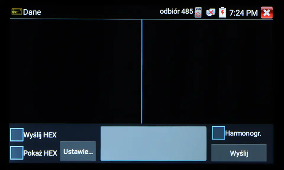 | Test linii rs-485, rs-232: | Testowanie danych z urządzenia sterującego (komendy są wyświetlane hexadecymalnie) |