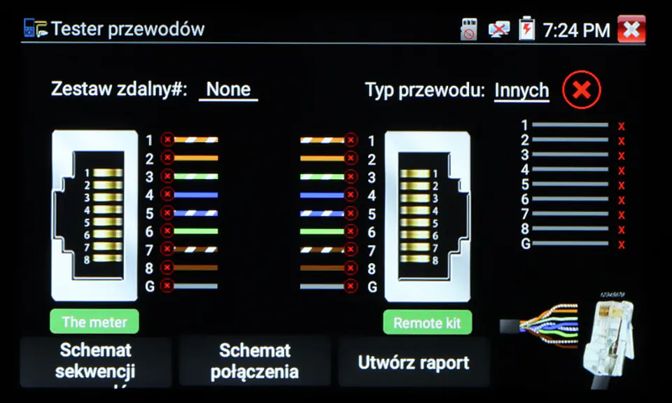 | Test skrętki lub linii telefonicznej: | Test połączenia kabli UTP lub telefonicznych, zakończonych wtykiem RJ-45 |