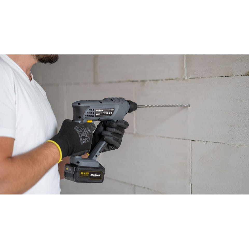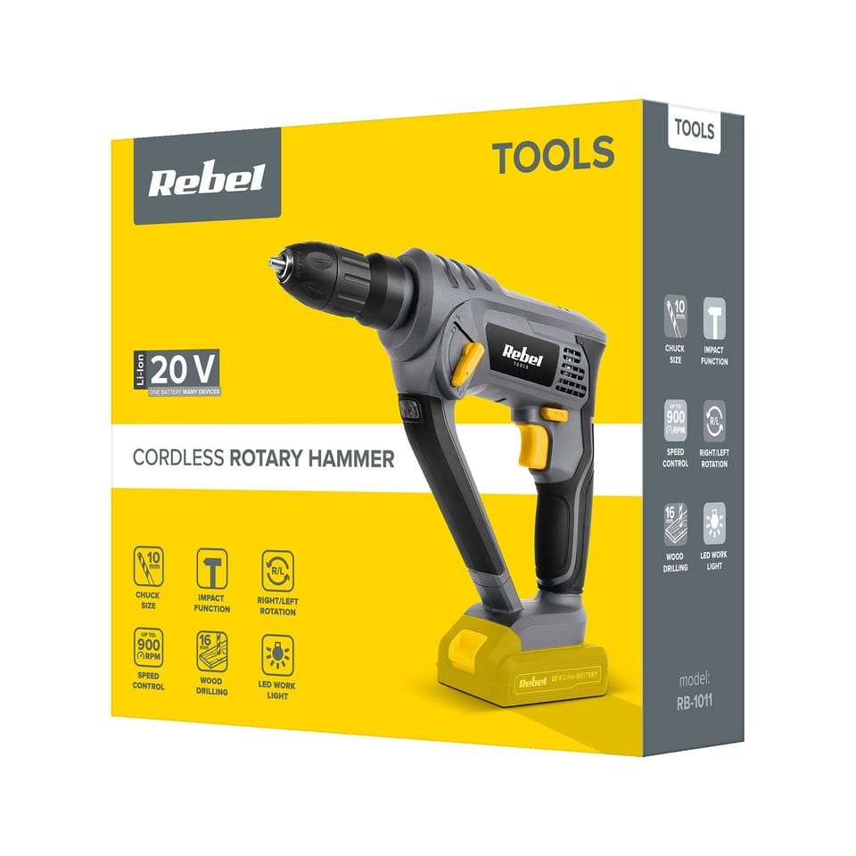 Funkcje: wiercenie z udarem, wiercenie bez udaruUchwyt SDSRegulacja prędkości obrotowejŚwiatło roboczeObroty w prawo/lewoErgonomiczna rękojeść-----------------------DANE TECHNICZNE-----------------------Akumulator: 20 V; 2 Ah, Li-Ion (RB-2001)*Czas ładowania: 1- 1,5 godz.Ładowarka sieciowa: 21 V; 2,2 A (RB-2001-CH)*Uchwyt: do 10 mmEnergia udaru: 1,3 JCzęstotliwość udaru: 5000 ud./min.Prędkość obrotowa bez obciążenia: 900 obr./min.Maks. średnica wiercenia w betonie: 10 mmMaks. średnica wiercenia w stali: 8 mmMaks. średnica wiercenia w drewnie: 16 mmWaga: 1,25 kgW zestawie: uchwyt SDS, instrukcja obsługiPoziom ciśnienia akustycznego LPA: 88 dB (A), K= 3 dB (A)Poziom mocy akustycznej LWA: 99 dB (A), K= 3 dB (A)Drgania ręka-ramię: ah (wiercenie bez udaru) 8,9 m/s2 K=1,5 m/s2* Brak w zestawie. Akumulator i ładowarka sprzedawane są oddzielnie.