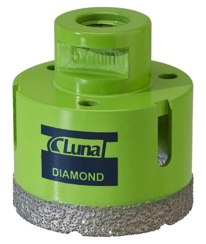 Wiertła diamentowe umożliwiające wiercenie na sucho. Z gwintem chwytowym M14 do mocowania w szlifierce kątowej. Do wykonywania otworów w glazurze, klinkierze, gresie, granicie, płytkach ceramicznych, marmurze itp. Wiertła mniejsze, o średnicy do 25 mm, należy ochłodzić wodą po wykonaniu każdego otworu. Większe wiertła nie wymagają takiego chłodzenia. Po włączeniu szlifierki przyłożyć wiertło ukośnie do płytki. Gdy wiertło lekko się zagłębi należy wykonywać narzędziem niewielki ruch okrężny. Ruch ten jest ważny aby pył powstający przy pracy był odsuwany, obniżając lokalnie temperaturę. Przy właściwym użytkowaniu, wiertłem mniejszym, tj. o średnicy do 25 mm można wykonać do 35 otworów, natomiast wiertłem większym do 100 otworów.