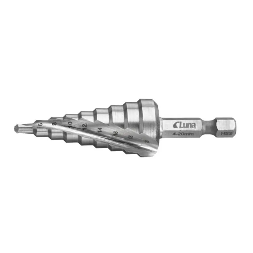 Dwuostrzowe wiertło stopniowe ze stali szybkotnącej, przeznaczone do wykonywania otworów w blachach, tworzywach sztucznych i laminatach. Pozostawia gładką powierzchnię cięcia, bez deformacji. Wierzchołek krzyżowy ułatwia centrowanie wycinanego otworu bez potrzeby uprzedniego wiercenia otworu prowadzącego. Maks. grubość blachy 5 mm (27082-0301 maks. grubość blachy 4 mm). Do bezpośredniego osadzania w elektrycznych lub akumulatorowych wiertarkach ręcznych lub w zwykłym uchwycie wiertarskim.