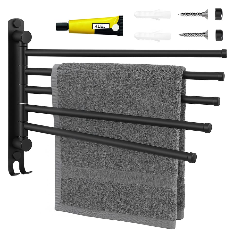 Wieszak łazienkowy na ręczniki ONTI czarnyModel: Onti | Kolor: czarny Wieszak na ręczniki z pięcioma obrotowymi ramionami oraz dodatkowym haczykiem zapewni porządek w Twojej łazience oraz przyśpieszy schnięcie ręczników. Ramiona można niezależnie ustawiać lub złożyć na dowolną stronę ściany. Wieszak został wykonany ze stali nierdzewnej , dzięki temu jest on estetyczny i wytrzymały.✔️W zestawie:Wieszak gotowy do montażuZestaw kołków montażowychZaślepkiKlej✔️Specyfikacja:stal nierdzewna SUS304elegancki wygląd5 ruchomych ramiondodatkowy haczykzestaw montażowyklejzaślepkimożliwość montażu na wkręty i na klej✔️Wymiary:wysokość 30 cmszerokość 3 cmdługość ramienia 33,5 cmgłębokość całkowita wieszaka 37 cmśrednica ramienia 1,2 cm Informacje dodatkowePrzedstawione kolory należy traktować poglądowo - mogą odbiegać od rzeczywistych ze względu na różne ustawienia monitorów oraz proces obróbki zdjęć. Rzeczywiste wymiary mogą się różnić od podanych wyżej. Tolerancja błędów może wynosić +/- 5%.Marka:GockowiakKod EAN:5902340332214Kolor:czarnyWysokość: 30 cmDługość ramienia:33,5 cmŚrednica ramienia:1,2 cmMateriał:stal nierdzewna