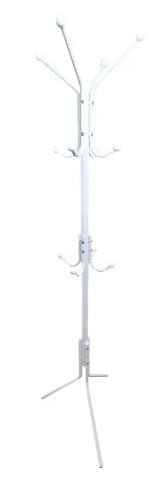 Podstawa wieszaka jest trójnożna, wieszak wykonany jest lakierowanego metalu.