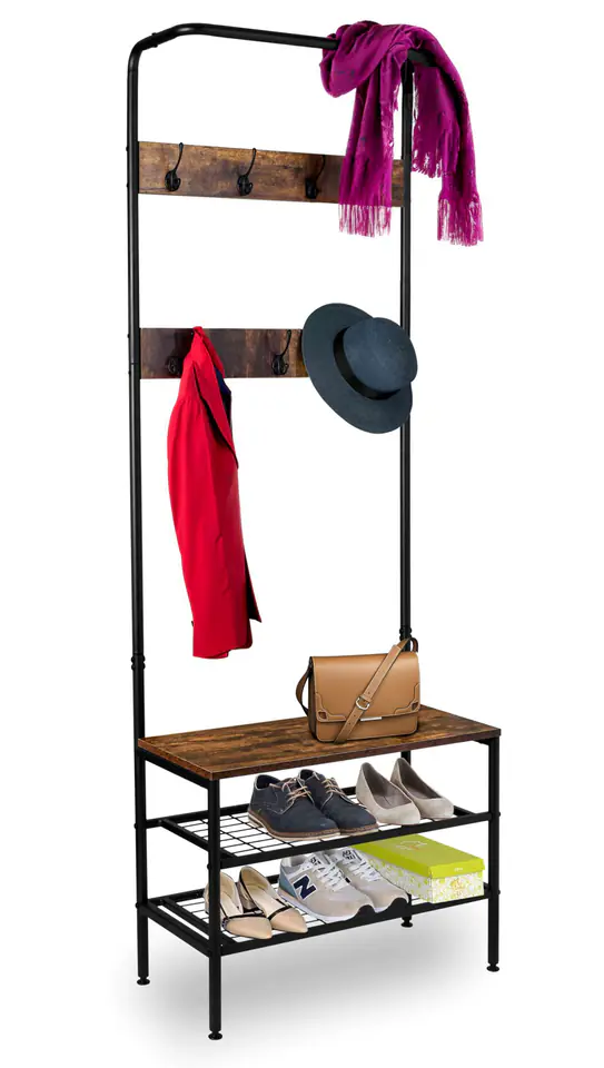 Wieszak loftowy do przedpokoju ODRYSPrzeznaczenie: garderoba, korytarz, hall | Kolor płyty: postarzany dąb Szukasz unikalnego wieszaka, który praktycznie pomieści ubrania i obuwie, dodając uroku przestrzeni? Nasz designerski wieszak stojący Odrys to harmonia funkcjonalności z estetyką. Idealny dla utrzymania porządku - górna belka może służyć jako dodatkowy wieszak, dwie drewniane poprzeczki z metalowymi hakami doskonale pomieszczą różne akcesoria. Stelaż z malowanej proszkowo stali gwarantuje trwałość, dolne stopki umożliwiają dopasowanie do przestrzeni. Wieszak oferuje miejsce na odzież i dwie półki na obuwie. Wygodne siedzisko z laminowanej płyty w kolorze dębu ułatwia codzienne czynności i dodaje uroku. Pasuje do wnętrz nowoczesnych, loftowych i rustykalnych. Cechy produktu✅Najwyższa jakość materiałów✅Minimalistyczny design✅Industrialna loftowa stylistyka✅Wpasuje się do każdego wnętrza✅Dodatkowa poprzeczka na wieszaki✅Aż 7 solidnych podwójnych mocnych haczyków✅Wygodne siedzisko, które może służyć jako półka✅Siedzisko z płyty laminowanej w kolorze postarzanego dębu✅Dwie metalowe półki na dole✅Solidna i stabilna stalowa konstrukcja✅Nóżki z możliwością regulacji dla poziomowania mebla Wymiary produktuWysokość: 185 cmWysokość do siedziska: 50 cmSzerokość: 66 cmGłębokość: 32 cmGrubość płyty: 16 mmŚrednica okrągłych profili: 22 mm Informacje dodatkowePrzedstawione kolory należy traktować poglądowo - mogą odbiegać od rzeczywistych ze względu na różne ustawienia monitorów oraz proces obróbki zdjęć. Rzeczywiste wymiary mogą się różnić od podanych wyżej. Tolerancja błędów może wynosić +/- 5%.Marka:GockowiakKod EAN:5902340329474Materiał:płyta laminowana, stal malowana proszkowoWysokość:185 cmWysokość do siedziska:50 cmSzerokośc siedziska::66 cmGłębokość:32 cm