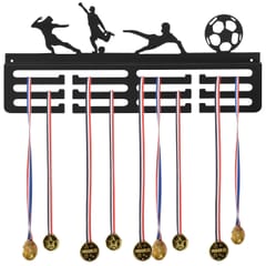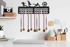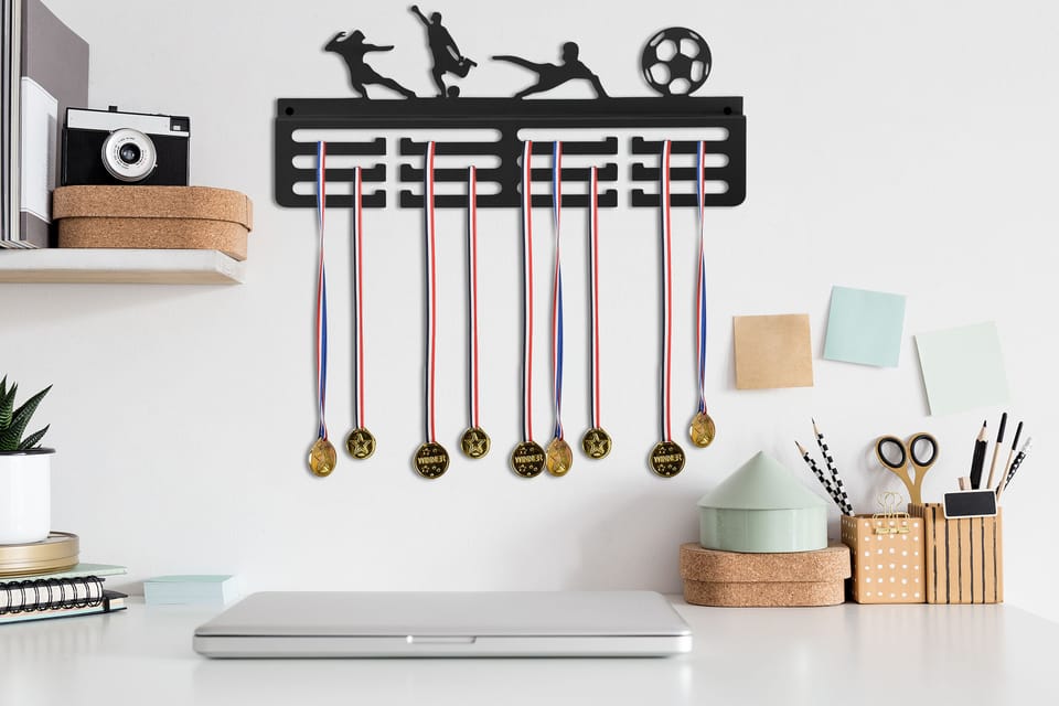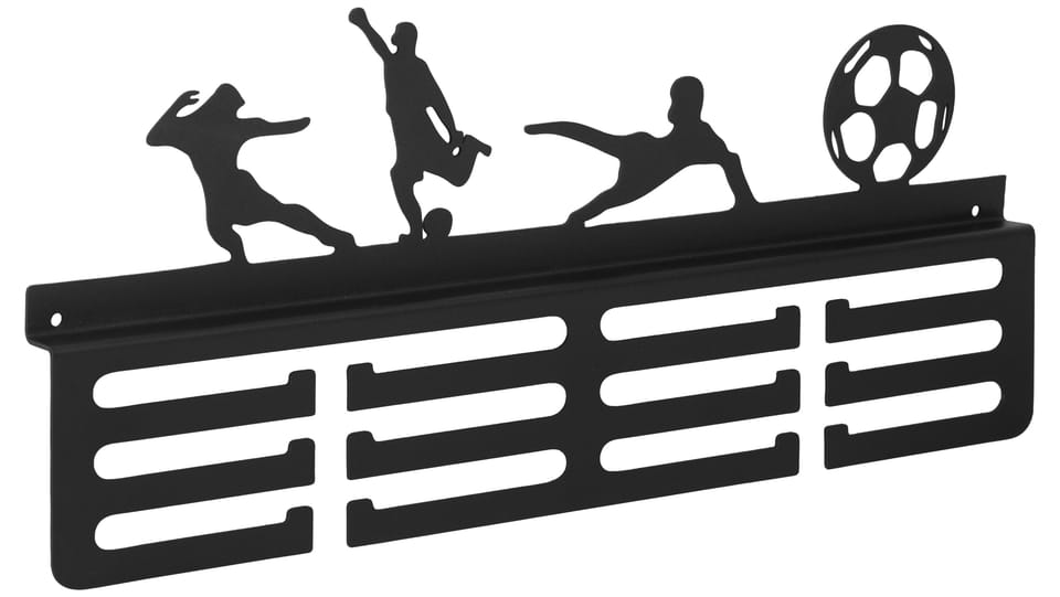 Wieszak na medale FOOTBALLMateriał: metal | Kolory: czarnyWieszak na medale to stylowy i praktyczny element dekoracyjny, must have na liście każdego, kto trenuje. Wycięty precyzyjną technologią laserową. Całość została dwustronnie polakierowana, dzięki czemu wieszak jest odporny na zadrapania. Polecamy także na prezent dla dzieci i nastolatków - pokażmy im, jak bardzo jesteśmy dumni z ich sukcesów! Zdecydowanie chętniej odłożą wtedy telefon, widząc w sporcie więcej korzyści. Cechy produktuWykonany z wysokiej jakości metaluNapis wycięty technologią laserowąDwustronne pokrycie wysokiej jakości lakierem dla ochrony przed zadrapaniamiW komplecie: kołki rozporowe i zaślepki w kolorze wieszakaWymiary produktuSzerokość: 40 cmWysokość: 17 cm Informacje dodatkowePrzedstawione kolory należy traktować poglądowo - mogą odbiegać od rzeczywistych ze względu na różne ustawienia monitorów oraz proces obróbki zdjęć. Rzeczywiste wymiary mogą się różnić od podanych wyżej. Tolerancja błędów może wynosić +/- 5%.Marka:GockowiakKod EAN:5902340327456Kolor:czarnyWysokość: 17 cmSzerokość:40 cmMontaż:kołki [w zestawie]Materiał:metal