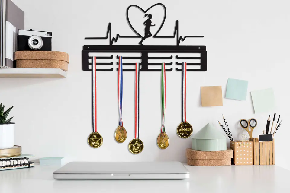 Wieszak na medale PULS BIEGACZKIModel: Puls biegaczki | Kolory: czarny Doskonały pomysł na prezent. Wieszak na medale to najmodniejszy gadżet do pokoju zarówno dzieci jak i dorosłych! Bardzo estetycznie wykonany, literki wycinane sa bowiem laserowo. Metalową konstrukcję zabezpieczono proszkowo matowym lakierem w czarnym kolorze. Dwanaście uchwytów pomieści od sześćdziesięciu do stu medali. Cechy produktuWykonany ze staliPodwójnie lakierowanyLitery wycięte technologią laserowąW komplecie: kołki rozporowe i zaślepki w kolorze wieszaka Wymiary Szerokość: 40 cmWysokość: 20 cm Informacje dodatkowePrzedstawione kolory należy traktować poglądowo - mogą odbiegać od rzeczywistych ze względu na różne ustawienia monitorów oraz proces obróbki zdjęć. Rzeczywiste wymiary mogą się różnić od podanych wyżej. Tolerancja błędów może wynosić +/- 5%. Marka:GockowiakKod produktu:5902340317808Kod EAN:5902340317808Kolor:czarnySzerokość: 40 cmWysokość:20 cm