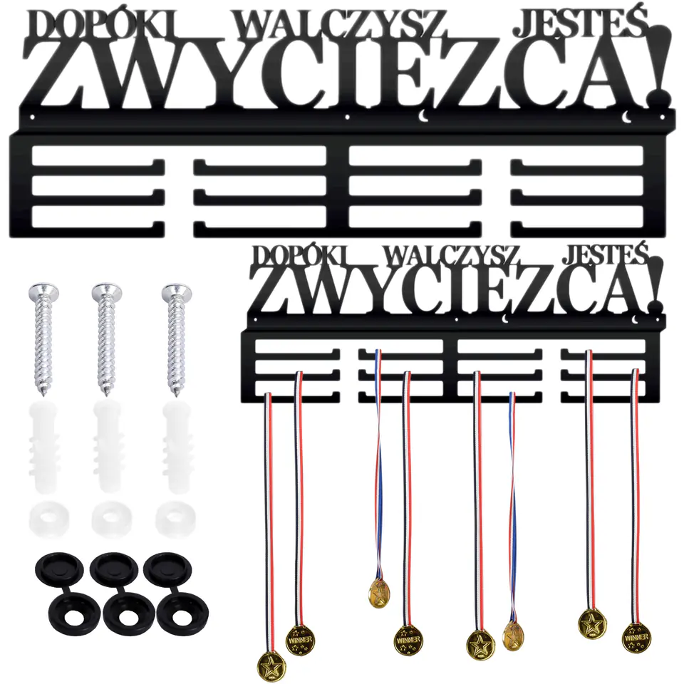 Wieszak na medale ZWYCIĘZCAModel: Zwycięzca | Kolory: czarny Doskonały pomysł na prezent. Wieszak na medale to najmodniejszy gadżet do pokoju zarówno dzieci jak i dorosłych! Bardzo estetycznie wykonany, literki wycinane sa bowiem laserowo. Metalową konstrukcję zabezpieczono proszkowo matowym lakierem w czarnym kolorze. Dwanaście uchwytów pomieści od sześćdziesięciu do stu medali. Cechy produktuWykonany ze staliPodwójnie lakierowanyLitery wycięte technologią laserowąW komplecie: kołki rozporowe i zaślepki w kolorze wieszaka Wymiary Szerokość: 60 cmWysokość: 22,5 cm Informacje dodatkowePrzedstawione kolory należy traktować poglądowo - mogą odbiegać od rzeczywistych ze względu na różne ustawienia monitorów oraz proces obróbki zdjęć. Rzeczywiste wymiary mogą się różnić od podanych wyżej. Tolerancja błędów może wynosić +/- 5%. Marka:GockowiakKod produktu:WIESZAK ZWYCIĘZCAKod EAN:5902340315422Kolor:czarnySzerokość: 60 cmWysokość:22,5 cm