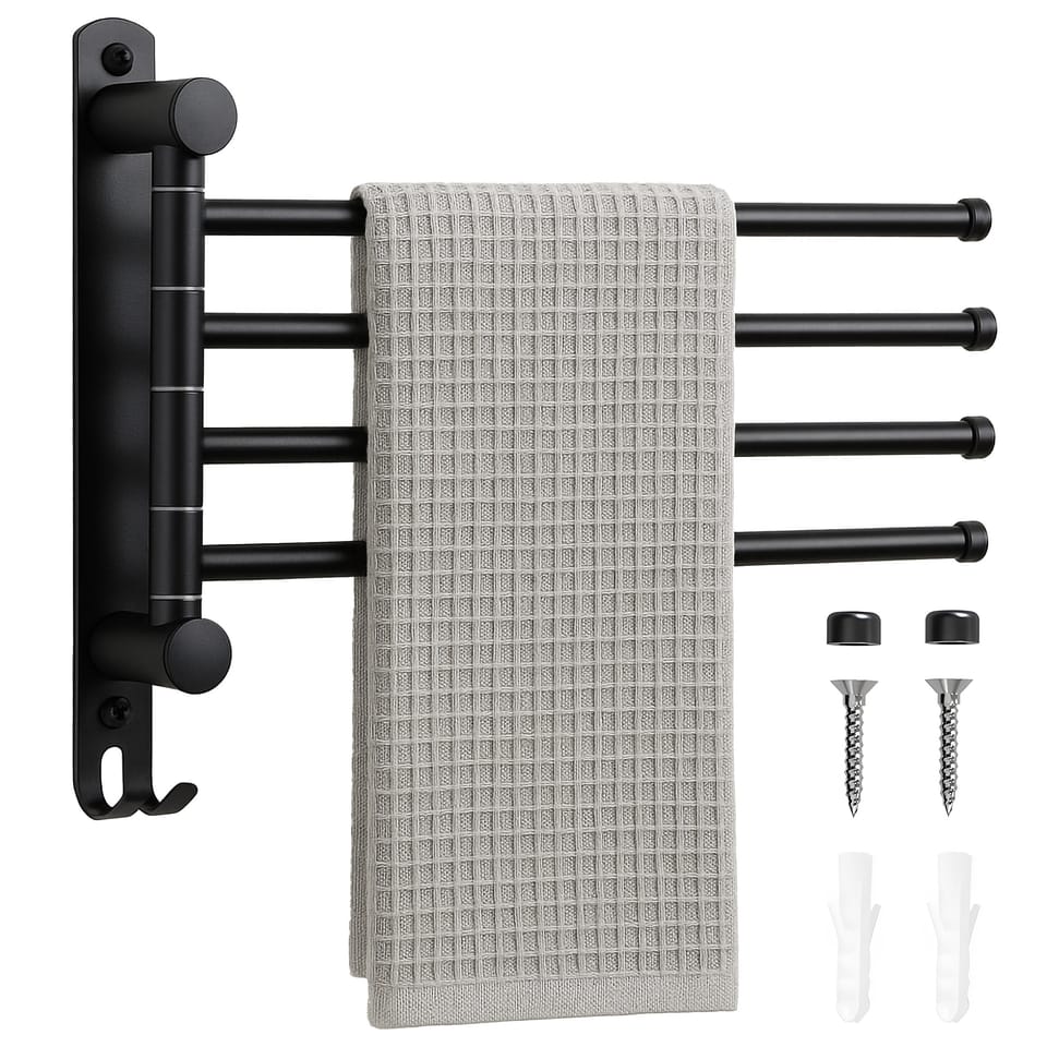 WIESZAK na ręczniki CETRI czarnyModel: CETRI | Kolor: CzarnyCzarny wieszak łazienkowy Cetri ma 4 ruchome ramiona, dzięki czemu można na nim rozwiesić 4 ręczniki. Wieszak został wykonany z trwałej, malowanej proszkowo stali – elegancki i odporny. Specyfikacja:➡️ Materiał: stal malowana proszkowo➡️ Kolor: czarny mat➡️ Liczba ramion: 4 (obracane)➡️ Dodatki: 1 dodatkowy haczyk➡️ Montaż: na ścianie, z zestawem montażowym i zaślepkami w komplecie (za pomocą kołków)Wymiary:➡️ Wysokość: 25 cm➡️ Szerokość: 3 cm➡️ Długość ramienia: 32 cm➡️ Głębokość całkowita: 35,5 cm➡️ Średnica ramienia: 1,2 cm Informacje dodatkowePrzedstawione kolory należy traktować poglądowo - mogą odbiegać od rzeczywistych ze względu na różne ustawienia monitorów oraz proces obróbki zdjęć. Rzeczywiste wymiary mogą się różnić od podanych wyżej. Tolerancja błędów może wynosić +/- 5%.Marka:GockowiakKod EAN:5902340332245Kolor:czarnyWysokość: 25 cmDługość ramienia:32 cmŚrednica ramienia:1,2 cmMateriał:stal nierdzewna