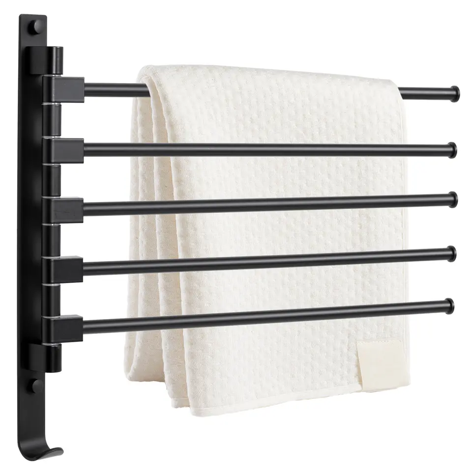 Wieszak na ręczniki Tyros czarny loftPrzeznaczenie: łazienka | Kolory: czarny Tyros to praktyczny i elegancki wieszak łazienkowy. Posiada dolny haczyk i aż pięć obrotowych, niezależnych od siebie ramion, które można ustawiać wg uznania lub złożyć całkiem w stronę ściany. Wieszak estetycznie wykonany z materiałów najwyższej jakości z zachowaniem dbałości o najdrobniejsze detale. Całość konstrukcji z aluminium, wykończonego na kolor czarnego matu. Model doskonale sprawdzi się w nowocześnie urządzonych łazienkach. Idealnie pasuje do stylu loftowego. Cechy produktuMateriał: aluminiumKolor: czarny mat5 obrotowych ramionHaczyk na akcesoriaZestaw montażowyZaślepkiNowoczesny wyglądWymiary produktuWysokość 37,5 cmSzerokość 3 cmDługość ramienia 37,5 cmGłębokość całkowita wieszaka 43 cmŚrednica ramienia 1,2 cmRozstaw śrub 30 cmOdstęp ramion 4 cm Informacje dodatkowePrzedstawione kolory należy traktować poglądowo - mogą odbiegać od rzeczywistych ze względu na różne ustawienia monitorów oraz proces obróbki zdjęć. Rzeczywiste wymiary mogą się różnić od podanych wyżej. Tolerancja błędów może wynosić +/- 5%.Marka:GockowiakKod EAN:322819MGKolor:czarnyWysokość: 37,5 cmDlugość ramienia:37,5 cmIlość ramion:5Materiał:aluminium