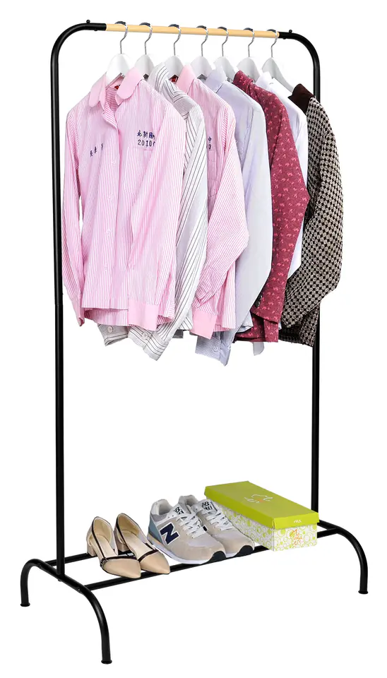 Wieszak na ubrania KITO czarnyPrzeznaczenie: hall, przedpokój, garderoba | Kolory: czarny Praktyczny wieszak wykonany z metalu. Posiada poprzeczkę długości 62 cm w kolorze jasnego drewna, dzięki czemu świetnie wpisuje się w styl skandynawski, loftowy i nowoczesny. Poprzeczka ma na końcach zabezpieczenia, zapobiegające zsuwaniu się wieszaków. Poniżej znajduje się praktyczna półka na buty. Prostota wykonania sprawia, że doskonale sprawdzi się w każdym pomieszczeniu. Cechy produktuPomieści sporo odzieżyPojemna półka na buty i akcesoriaProdukt wysokiej jakościElegancki o przyjaznej kolorystyceEstetyczne wykonanieNowoczesny designMetalowy drążek imitujący drewnoBlokady przed zsuwaniem się odzieżyStabilna stalowa konstrukcjaMateriał wykonania: stalMaksymalne równomierne obciążenie: 10 kg Wymiary produktuWysokość 150 cmSzerokość 79 cmGłębokość: 41 cm Informacje dodatkowePrzedstawione kolory należy traktować poglądowo - mogą odbiegać od rzeczywistych ze względu na różne ustawienia monitorów oraz proces obróbki zdjęć. Rzeczywiste wymiary mogą się różnić od podanych wyżej. Tolerancja błędów może wynosić +/- 5%.Marka:GockowiakKod EAN:323977MGKolor:czarnyWysokość: 150 cmSzerokość:79 cmGłębokość:41 cmDrążek w kolorze drewna:62 cm