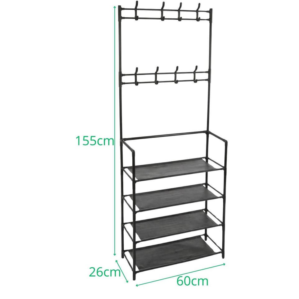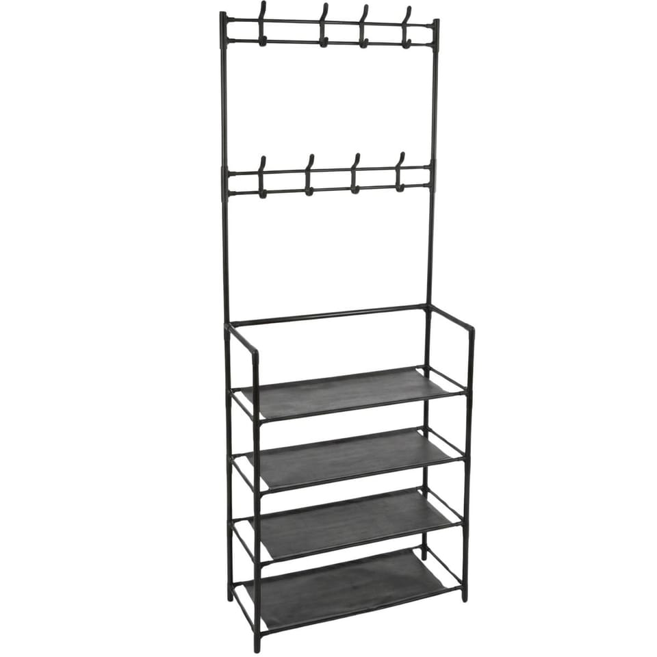 - pasuje do każdej aranżacjiwieszak i regał w jednymwyposażony w 8 haczyków na ubrania i 4 półki na butyodpowiedni zarówno do małych jak i dużych przestrzeniłatwy i szybki w montażu