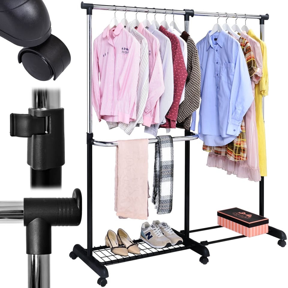 Wieszak regulowany stojący na kółkach Rufo czarny⭐️ Stabilny wieszak na kółkach⭐️ Solidna stalowa konstrukcja z chromowanymi elementami⭐️ Pojemny drążek na wieszaki⭐️ Półki na buty, pudełka⭐️ Regulacja wysokości i szerokości⭐️ Zakup od producenta✨Wieszak stojący Rufo czarny - Regulowany wieszak garderobiany na kółkach✨Wieszak stojący Rufo czarny to eleganckie i praktyczne rozwiązanie do przechowywania ubrań, które sprawdzi się zarówno w przestrzeni domowej, jak i biurowej. Wyposażony w możliwość regulacji wysokości oraz szerokości, pozwala dopasować go do indywidualnych potrzeb. Solidna, stalowa konstrukcja zapewnia stabilność i trwałość użytkowania przez długie lata. Mobilne kółka ułatwiają przesuwanie wieszaka w dowolne miejsce, a dodatkowa półka na obuwie pomaga utrzymać ład i porządek w garderobie. To funkcjonalny mebel, który oszczędza miejsce, organizuje przestrzeń i dba o Twoją odzież.Cechy:Materiał: Stal malowana proszkowo, tworzywo sztuczneKolor: Czarny, elementy chromowaneRegulacja wysokości i szerokościMaksymalne równomierne obciążenie: 18 kg Wymiary:Wysokość: 93 – 165 cmSzerokość: 92 – 162 cmGłębokość: 44 cmGłębokość półki na obuwie: 24,5 cmŚrednice rurek:1x chromowana: 3,2 cm5x chromowana: 2,9 cm3x czarna: 3,2 cm2x czarna: 1,9 cm2x czarna: 1,6 cm Informacje dodatkowePrzedstawione kolory należy traktować poglądowo - mogą odbiegać od rzeczywistych ze względu na różne ustawienia monitorów oraz proces obróbki zdjęć. Rzeczywiste wymiary mogą się różnić od podanych wyżej. Tolerancja błędów może wynosić +/- 5%.Marka:GockowiakKod produktu:RUFO CZARNYKod EAN:5902340310397Kolor:czarnyWysokość: 93-165 cmSzerokość:92-162 cmMateriał:metalPrzeznaczenie:sypialnia | korytarz | salon | biuroDo samodzielnego montażu:tak