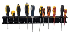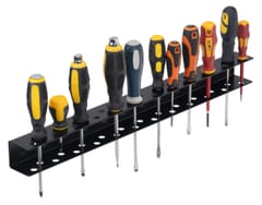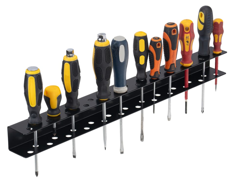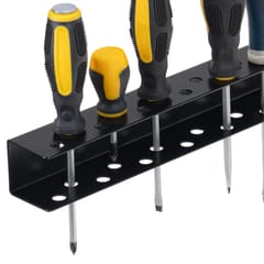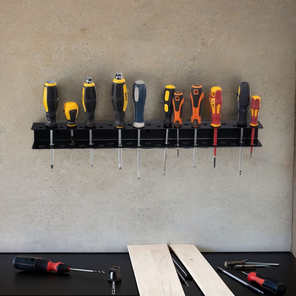 Wieszak ścienny na narzędzia szyna CARMINPrzeznaczenie: warsztat, garaż, pomieszczenie gospodarcze | Kolor: czarny | Materiał: metal Wieszak na narzędzia marki Carmin to doskonałe rozwiązanie dla osób, które chcą utrzymać porządek i zoptymalizować organizację w warsztacie, garażu czy piwnicy. Dzięki wytrzymałej metalowej konstrukcji pokrytej czarną powłoką proszkową, wieszak jest nie tylko solidny, ale także stylowy, pasując do różnych przestrzeni. Pomieści aż 29 wkrętaków, zapewniając wygodny dostęp do narzędzi i lepsze zarządzanie miejscem pracy. Montaż na ścianie jest prosty, a zestaw zawiera wszystkie niezbędne elementy. Szyna ścienna Carmin zyskujesz porządek, oszczędność miejsca oraz lepszą organizację narzędzi. SpecyfikacjaMateriał: Stal malowana proszkowoWaga: 0,71 kgKolor: CzarnyMaksymalna pojemność: 29 śrubokrętówMaksymalne obciążenie: 8 kgZawartość zestawu: kołki montażowe 3 szt., instrukcja montażu WymiaryWysokość: 4,5 cmSzerokość: 50 cmGłębokość: 4,5 cm23 miejsca z otworami: 0,8 cm Informacje dodatkowePrzedstawione kolory należy traktować poglądowo - mogą odbiegać od rzeczywistych ze względu na różne ustawienia monitorów oraz proces obróbki zdjęć. Rzeczywiste wymiary mogą się różnić od podanych wyżej. Tolerancja błędów może wynosić +/- 5%.Marka:GockowiakKod EAN:5902340331200Kolor:czarnyMateriał:Stal malowana proszkowoSzerokość:50 cmWysokość:4,5 cmGłębokość:4,5 cm