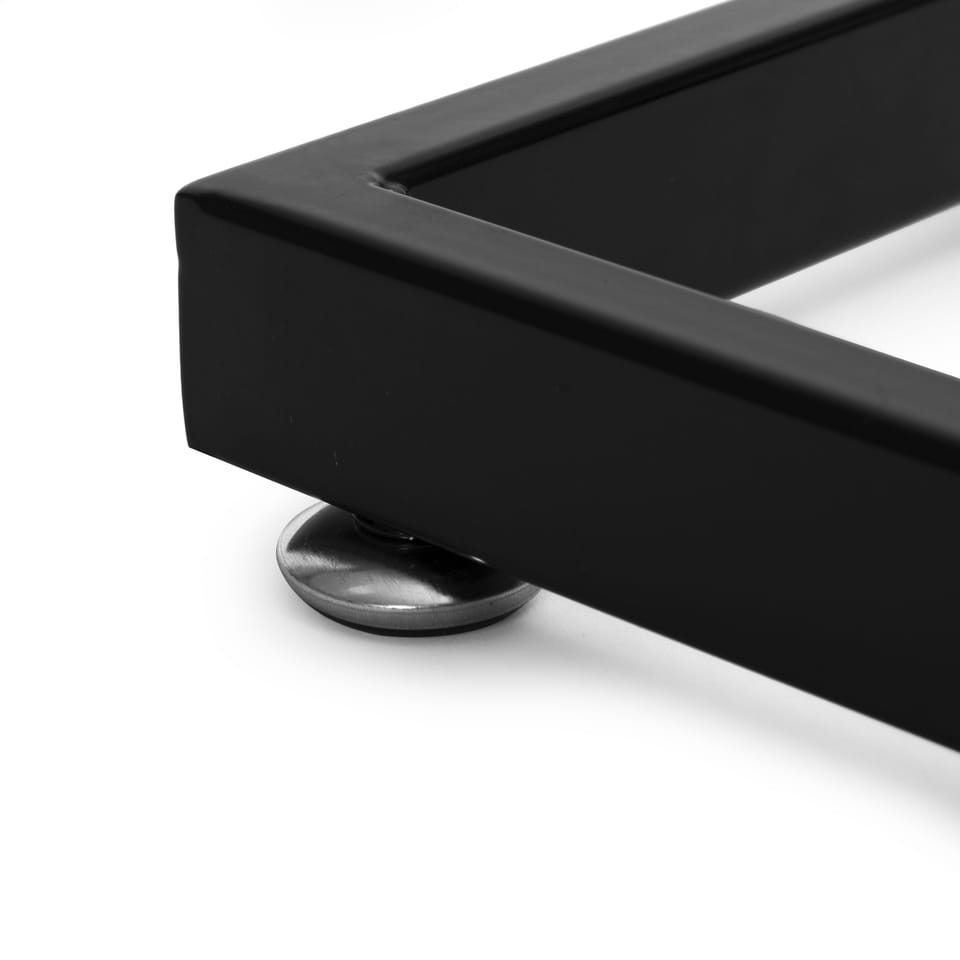 Podstawę wieszaka tworzą metalowe profile w kształcie prostokąta, dzięki odpowiedniej szerokości wieszak jest stabilny nawet przy pełnym obciążeniu. Do podstawy wkręcane są specjalne stopki ochronne, które zabezpieczą podłogę przed zarysowaniami, dodatkowo ich odpowiednie wkręcanie pomoże w wypoziomowaniu wieszaka na nierównych powierzchniach.