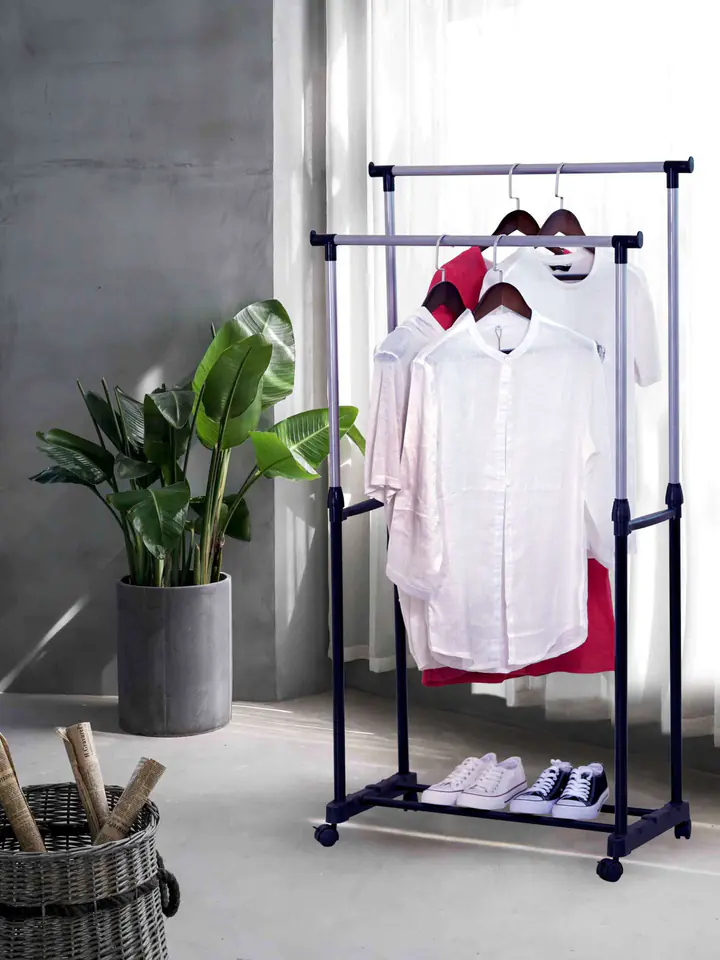 Wieszak stojący na kółkach MIA podwójny czarnyPrzeznaczenie: biurko, hall, przedpokój | Kolory: srebrny, czarny Oferujemy praktyczny i wytrzymały wieszak garderobiany na kółkach MIA. Wieszak sprawdzi się w każdym domu i w biurze, w którym brakuje miejsca do powieszenia odzieży. Nasz produkt został wyposażony w podwójny drążek, którego wysokość można łatwo regulować za pomocą zacisków oraz kółka umożliwiające wygodne przemieszczanie. Dodatkowym atutem wieszaka są nakładki na końce drążka uniemożliwiające zsunięcie się wieszaków z odzieżą. Montaż wieszaka jest niezwykle prosty i nie wymaga użycia narzędzi. Cechy produktuProsty i szybki montażWytrzymała konstrukcja z metalowych rurekObejmy z tworzywa sztucznegoDrążek z zabezpieczeniem przed zsunięciem się wieszakaRegulowana wysokość między 78 cm a 130 cmKółka pozwalające łatwo przesunąć wieszakŁącznik wykonane z wysokiej jakości tworzywa sztucznegoCałkowite dopuszczalne obciążenie: 10kgWymiary produktu Wysokość (regulowana): 78-130 cmSzerokość: 67 cmSzerokość podstawy: 64 cmGłębokość: 41 cmRurki średnicy: 20 mm, 21 mmGłębokość wieszaka (mierzona przy kółkach): 41 cmRozstaw półki na buty: 19 cm Informacje dodatkowePrzedstawione kolory należy traktować poglądowo - mogą odbiegać od rzeczywistych ze względu na różne ustawienia monitorów oraz proces obróbki zdjęć. Rzeczywiste wymiary mogą się różnić od podanych wyżej. Tolerancja błędów może wynosić +/- 5%. Marka:GockowiakKod produktu:WIESZAK STOJĄCY MIAKod EAN:5902340311325Kolor:czarny, srebrnyWysokość: 78- 130 cmSzerokość:67 cmMateriał:metal, tworzywoDo samodzielnego montażu:tak