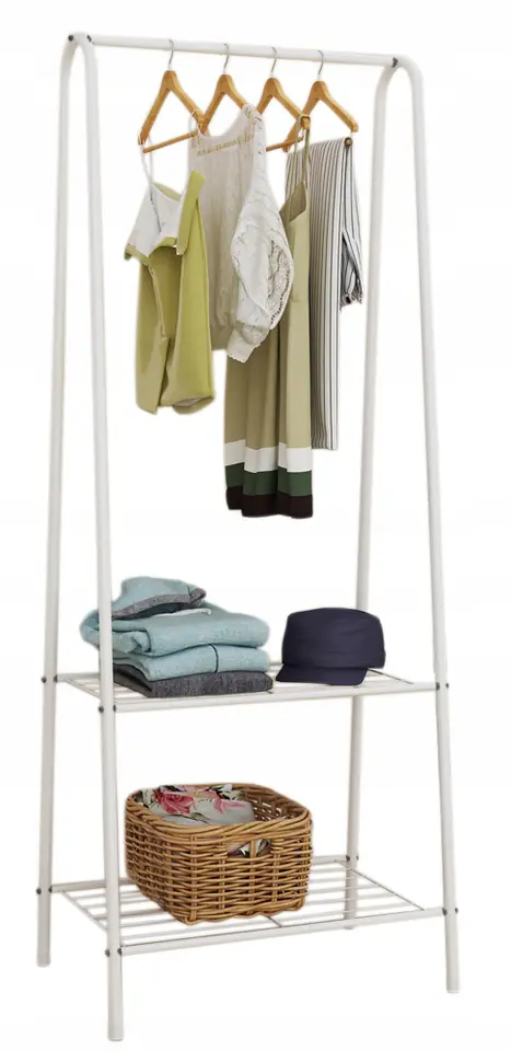 Wieszak stojący na ubrania OLIVIER biały Przeznaczenie: garderoba, przedpokój, łazienka | Kolory: biały Wieszak stojący garderobiany w nowoczesnym i minimalistycznym stylu. Doskonale sprawdzi się w domu jako wieszak na odzież w garderobie, jako wieszak w przedpokoju na kurtki dla gości lub jako wieszak łazienkowy.Jego przeznaczenie zależy od Ciebie. Wieszak wyposażony w górny drążek oraz dwie półki w dolnej części. Montaż wieszaka jest niezwykle prosty i nie wymaga użycia narzędzi. Nowoczesna konstrukcja sprawia, że wieszak sprawdzi się każdym mieszkaniu lub lokalu usługowym. Cechy produktuPraktyczny i wytrzymały wieszak garderobianyMinimalistyczny designWytrzymała konstrukcja z metalowych rurekIdealny do mieszkania lub lokalu usługowegoPrzeznaczony do przedpokoju lub sypialniPosiada drążek na wieszaki oraz dwie półkiProsty i szybki montażMateriał - metal lakierowanyMaksymalne, równomierne obciążenie: 10kgWymiary produktuWysokość: 154 cmSzerokość: 60 cmGłębokość: 35 cmGórna półka: 51 x 28 cmDolna półka: 51 x 32,5 cmŚrednica rurek: 16 mm Informacje dodatkowePrzedstawione kolory należy traktować poglądowo - mogą odbiegać od rzeczywistych ze względu na różne ustawienia monitorów oraz proces obróbki zdjęć. Rzeczywiste wymiary mogą się różnić od podanych wyżej. Tolerancja błędów może wynosić +/- 5%. Marka:GockowiakKod produktu:5902340317884Kod EAN:5902340317884Kolor:białyWysokość: 154 cmSzerokość:60 cmGrubość nogi:1,6 cmDo samodzielnego montażu:tak