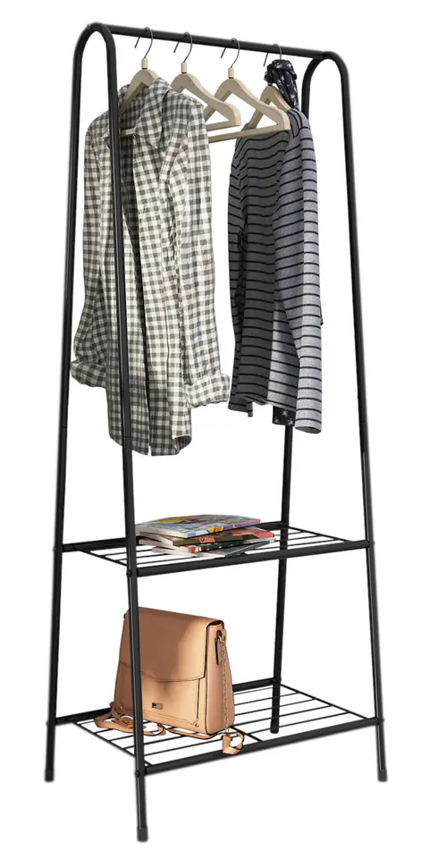 Wieszak stojący na ubrania OLIVIER czarny loftPrzeznaczenie: garderoba, przedpokój, łazienka | Kolory: czarny Wieszak stojący garderobiany w nowoczesnym i minimalistycznym stylu. Doskonale sprawdzi się w domu jako wieszak na odzież w garderobie, jako wieszak w przedpokoju na kurtki dla gości lub jako wieszak łazienkowy.Jego przeznaczenie zależy od Ciebie. Wieszak wyposażony w górny drążek oraz dwie półki w dolnej części. Montaż wieszaka jest niezwykle prosty i nie wymaga użycia narzędzi. Nowoczesna konstrukcja sprawia, że wieszak sprawdzi się każdym mieszkaniu lub lokalu usługowym. Cechy produktuPraktyczny i wytrzymały wieszak garderobianyMinimalistyczny designWytrzymała konstrukcja z metalowych rurekIdealny do mieszkania lub lokalu usługowegoPrzeznaczony do przedpokoju lub sypialniPosiada drążek na wieszaki oraz dwie półkiProsty i szybki montażMateriał - metal lakierowanyMaksymalne, równomierne obciążenie: 10kgWymiary produktuWysokość: 154 cmSzerokość: 60 cmGłębokość: 35 cmGórna półka: 51 x 28 cmDolna półka: 51 x 32,5 cmŚrednica rurek: 16 mm Informacje dodatkowePrzedstawione kolory należy traktować poglądowo - mogą odbiegać od rzeczywistych ze względu na różne ustawienia monitorów oraz proces obróbki zdjęć. Rzeczywiste wymiary mogą się różnić od podanych wyżej. Tolerancja błędów może wynosić +/- 5%. Marka:GockowiakKod produktu:OLIVIER CZARNYKod EAN:5902340316573Kolor:czarnyWysokość: 154 cmSzerokość:60 cmGrubość nogi:1,6 cmDo samodzielnego montażu:tak