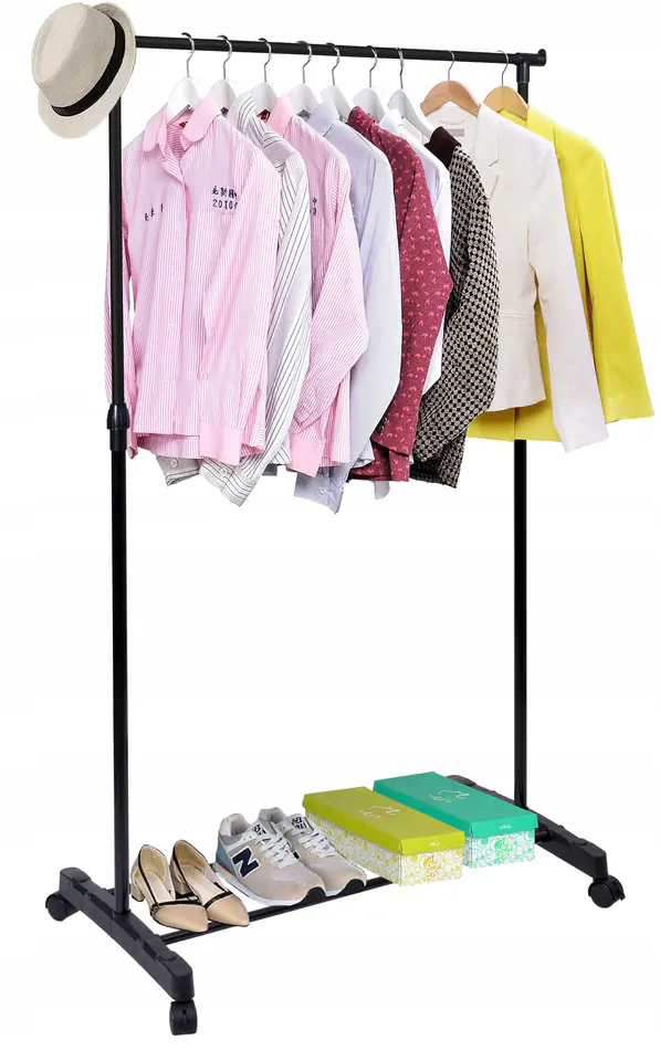 Mobilny wieszak stojący na kółkach BESPrzeznaczenie: garderoba, butik, biuro, studio | Kolory: czarny Praktyczny i wytrzymały wieszak garderobiany na kółkach. Wieszak BES sprawdzi się w każdym domu i w biurze, w którym brakuje miejsca do powieszenia odzieży. Nasz produkt został wyposażony w wytrzymały drążek, który pomieści naprawdę dużo odzieży. Dodatkowym atutem wieszaka są nakładki na końce drążka, uniemożliwiające zsunięcie się wieszaków z odzieżą. Montaż wieszaka jest niezwykle prosty i nie wymaga użycia narzędzi. Czarny kolor wieszaka sprawi, że doskonale wpisze się w każdy styl wnętrza, w szczególności glamour i loft. Cechy produktuWytrzymała konstrukcja z metalowych rurekObejmy z tworzywa sztucznegoDrążek z zabezpieczeniem przed zsunięciem się wieszakaKółka pozwalające łatwo przesunąć wieszakŁącznik wykonane z wysokiej jakości tworzywa sztucznegoCałkowite dopuszczalne obciążenie: 6 kg Wymiary produktuWysokość: 78 - 130 cmSzerokość: 67 cmGłębokość: 41 cmGłębokość półki na buty: 19 cmŚrednica rurek dolnej półki: 16 mmŚrednica rurek bocznych czarnych: 22 mmŚrednica rurki górnej: 19 mmMaksymalne równomierne obciążenie wieszaka to 6 kg Informacje dodatkowePrzedstawione kolory należy traktować poglądowo - mogą odbiegać od rzeczywistych ze względu na różne ustawienia monitorów oraz proces obróbki zdjęć. Rzeczywiste wymiary mogą się różnić od podanych wyżej. Tolerancja błędów może wynosić +/- 5%.Marka:GockowiakKod EAN:322901MGKolor:czarnyWysokość całkowita: 78-130 cmSzerokość poprzeczki:67 cmGłębokość wieszaka:41 cmDo samodzielnego montażu:tak