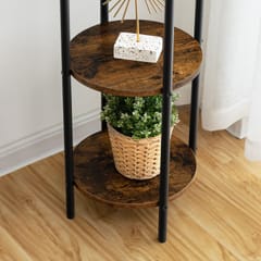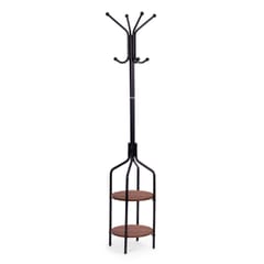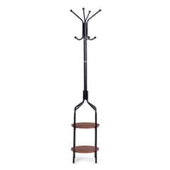 Podstawę wieszaka tworzą 4 szeroko rozstawione nogi, dzięki temu jest on stabilny nawet przy dużym obciążeniu. Każda z nóg zakończona jest stopką, która ochroni Twoją podłogę przed zarysowaniami. Między nogami umieszczono 2 półki wykonane z płyty wiórowej o grubości 1,5 cm i średnicy 34 cm, dzięki nim zyskasz miejsce na drobiazgi i akcesoria, które lubisz mieć pod ręką.